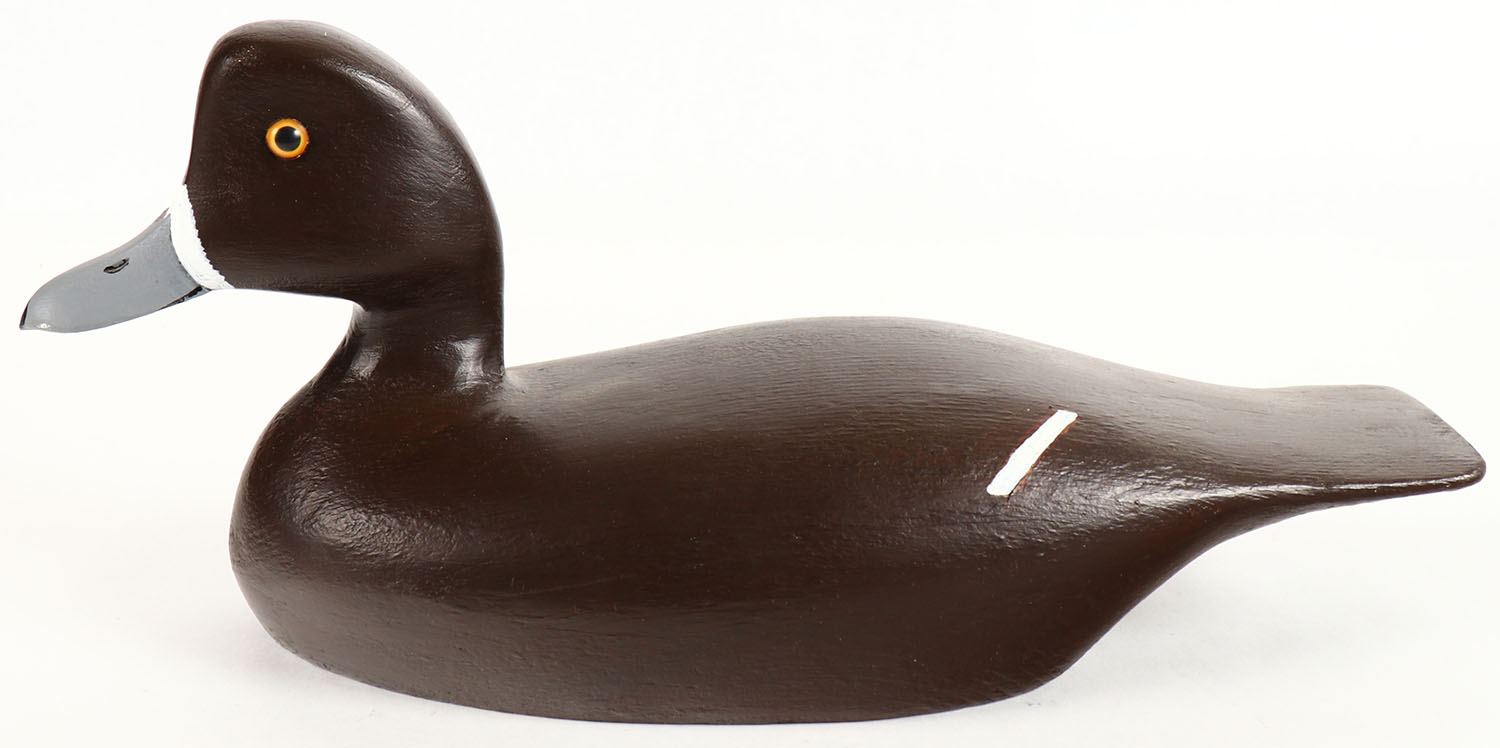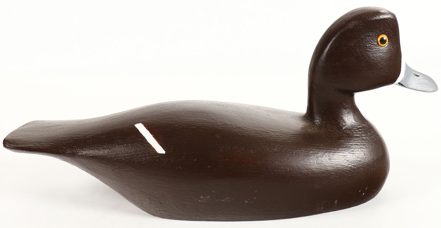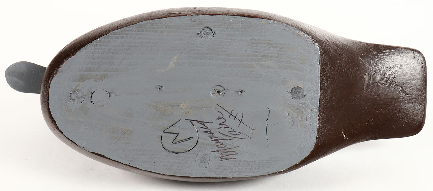 Bluebill Hen by Maynard Caine, Ontario, Canada, glass eyes, solid wood, original paint, structurally excellent, branded CM on bottom. Grade: Excellent ++ - Value: 30 to 60