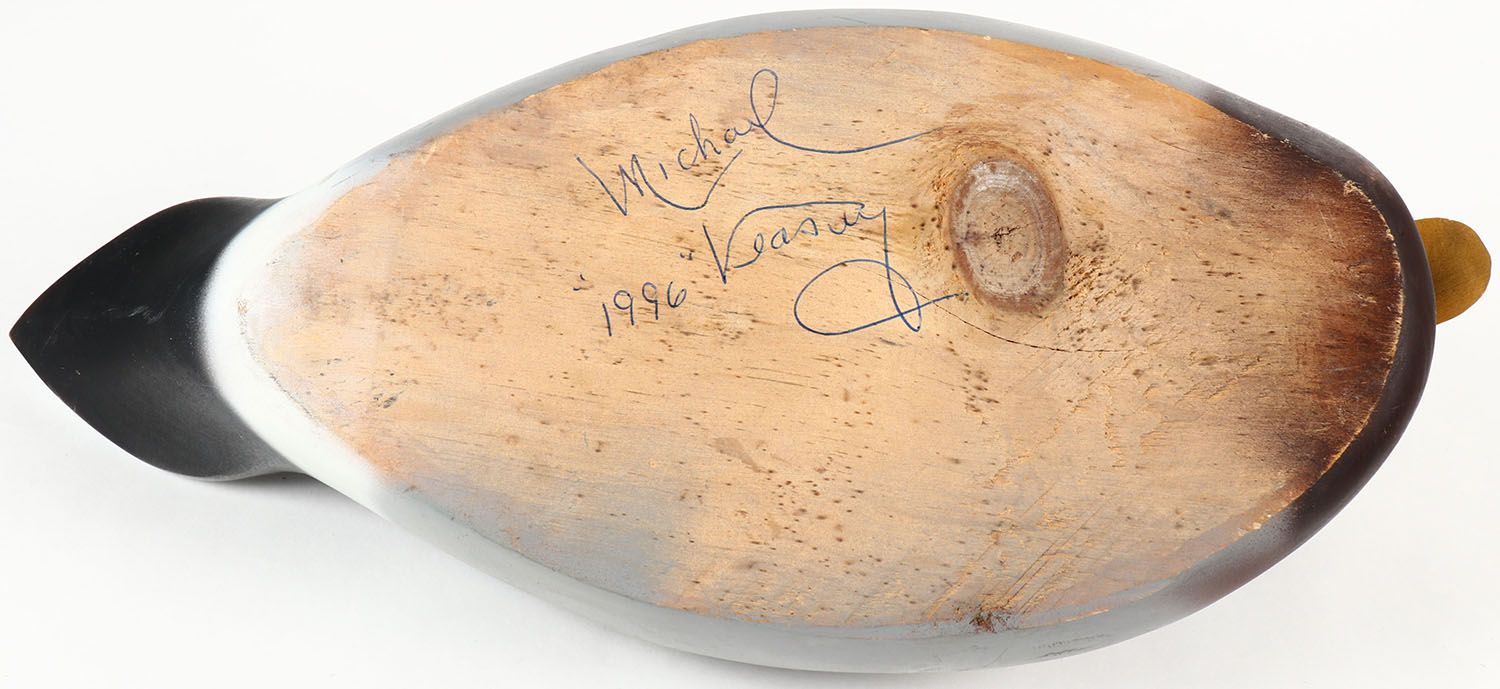 Mallard Drake by Michael Veasey, Delaware, GE, solid wood, original paint, structurally excellent, signed on bottom by maker, 17 1/4'' OAL. Grade: Excellent + - Value: 30 to 60