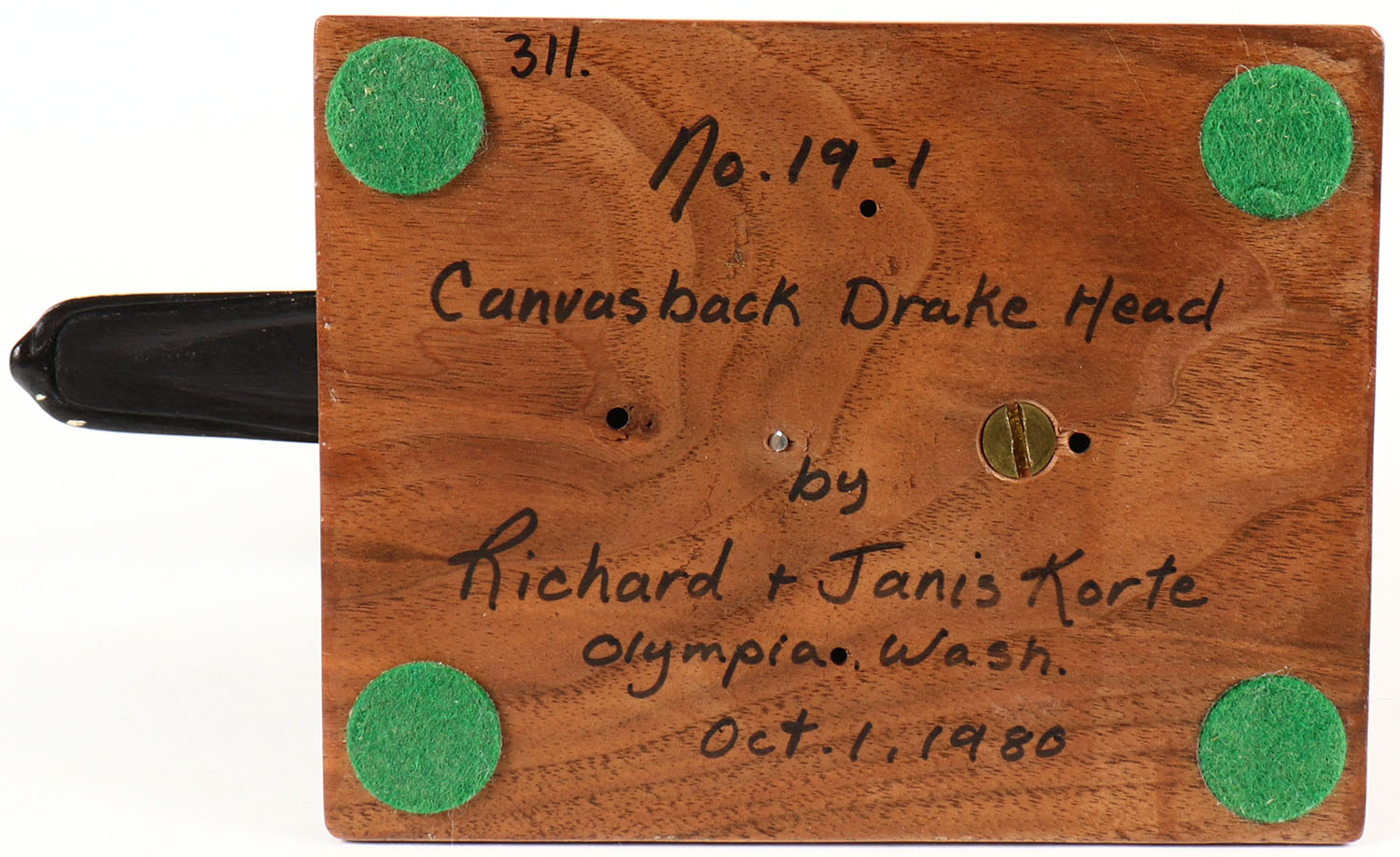 Canvasback Drake Head by Richard & Janis Korte, Olympia, WA, circa 1980, GE, solid wood with feather detail, mint original paint, mounted on a wood base, 7 1/2'' width. Grade: MINT - Value: 20 to 60