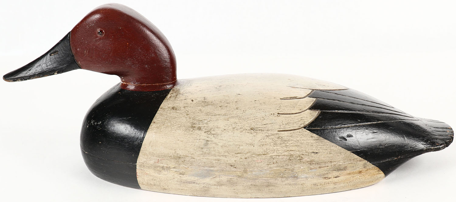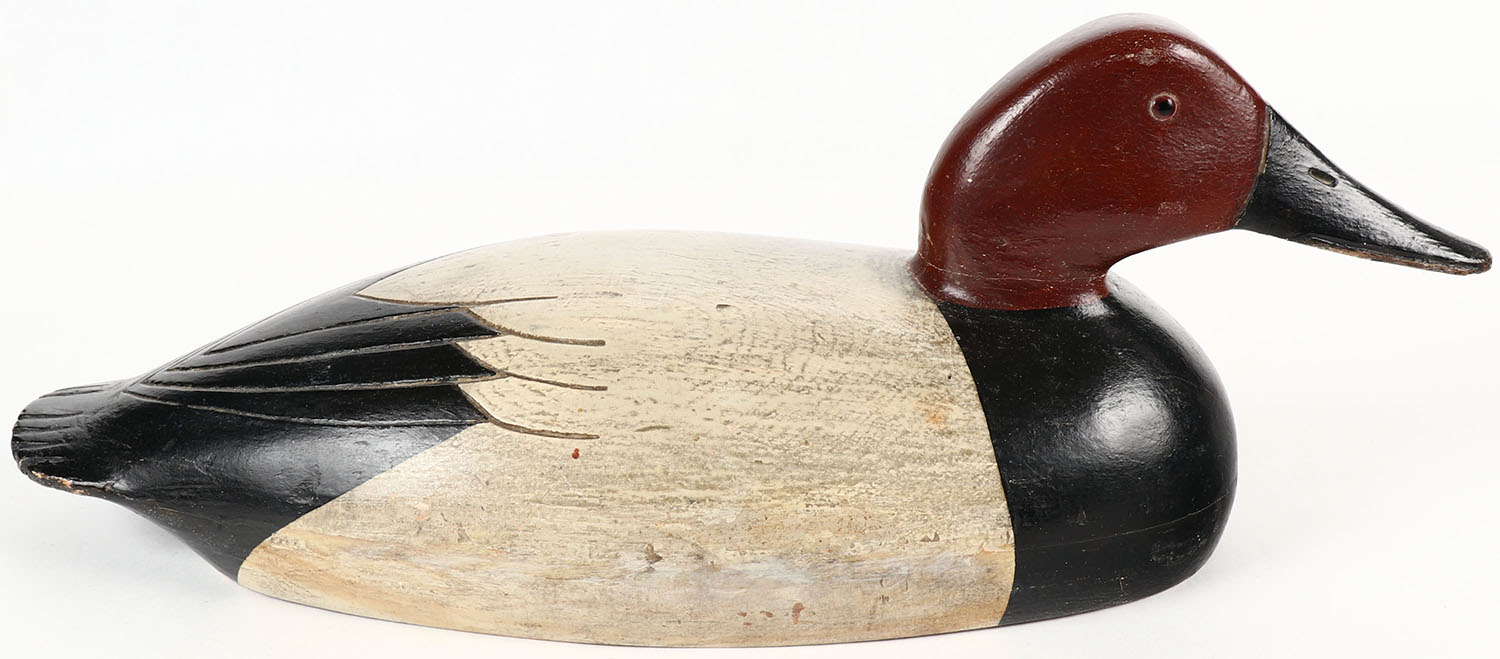 Canvasback Drake by Jess Heisler, Burlington NJ, (1861-1943), Heisler used John English patterns, it's weight of 4lbs suggests it was made as a door stop, GE, solid wood with lead in body, original paint, 14 1/2'' OAL. Grade: Excellent - Value: 30 to 90