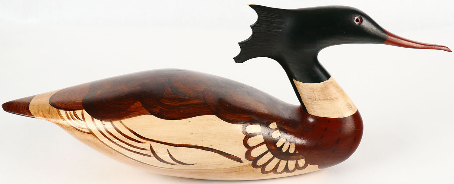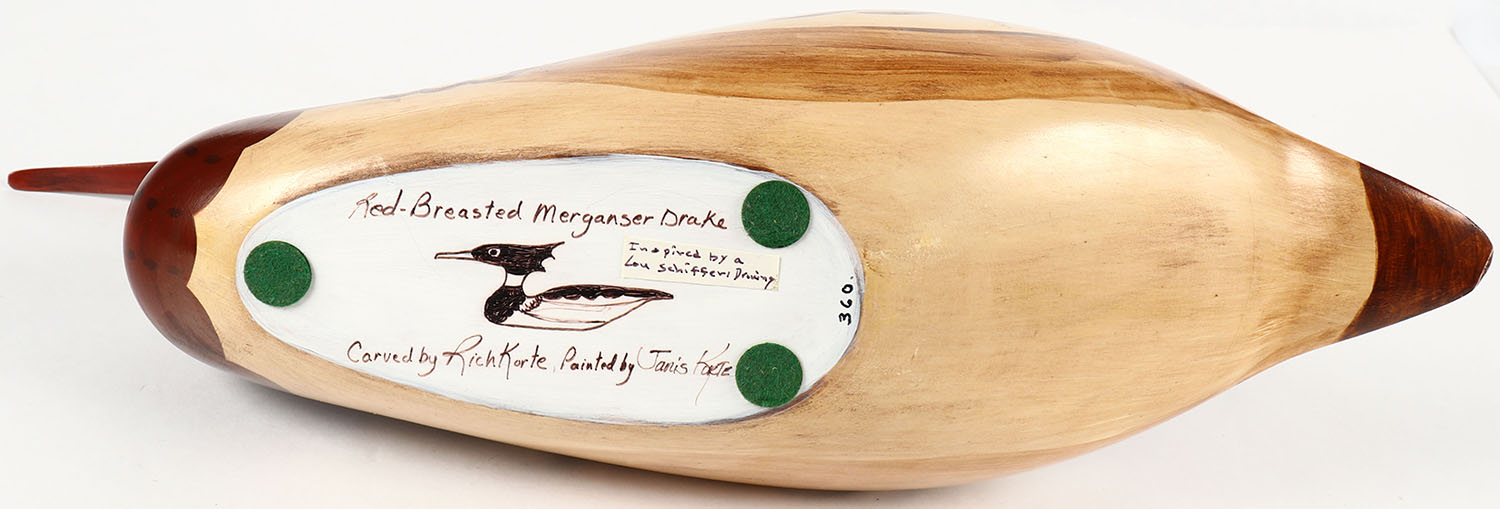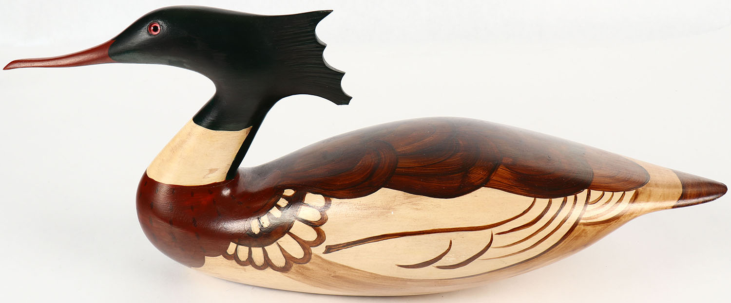 Merganser Drake by Richard & Janis Korte, Olympia, WA, circa 1980, GE, solid wood, mint original paint, artist proof on bottom, 16 1/2'' width. Grade: MINT - Value: 30 to 90