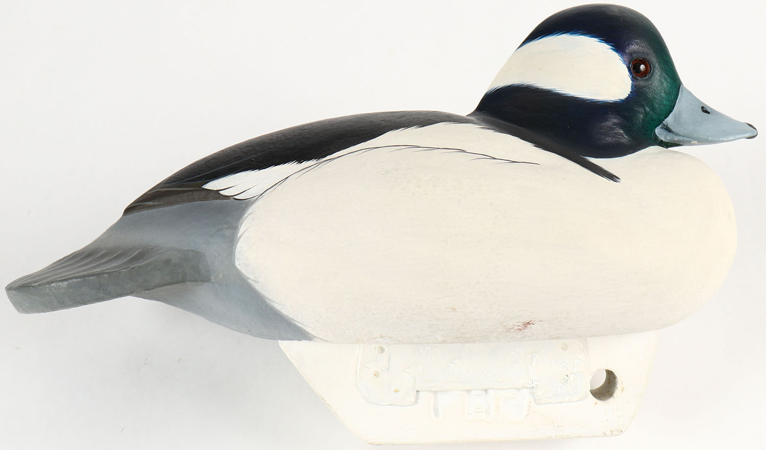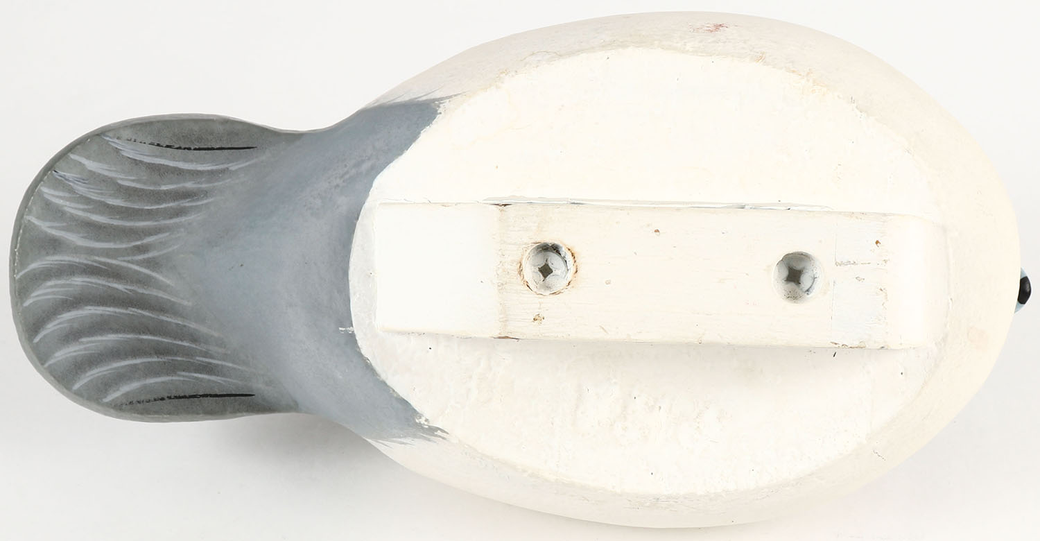 Low Head Bufflehead Drake by F H Jennings, GE, soldi wood original paint, branded FHJ & signed, 11'' OAL. Grade: Excellent ++ - Value: 30 to 90