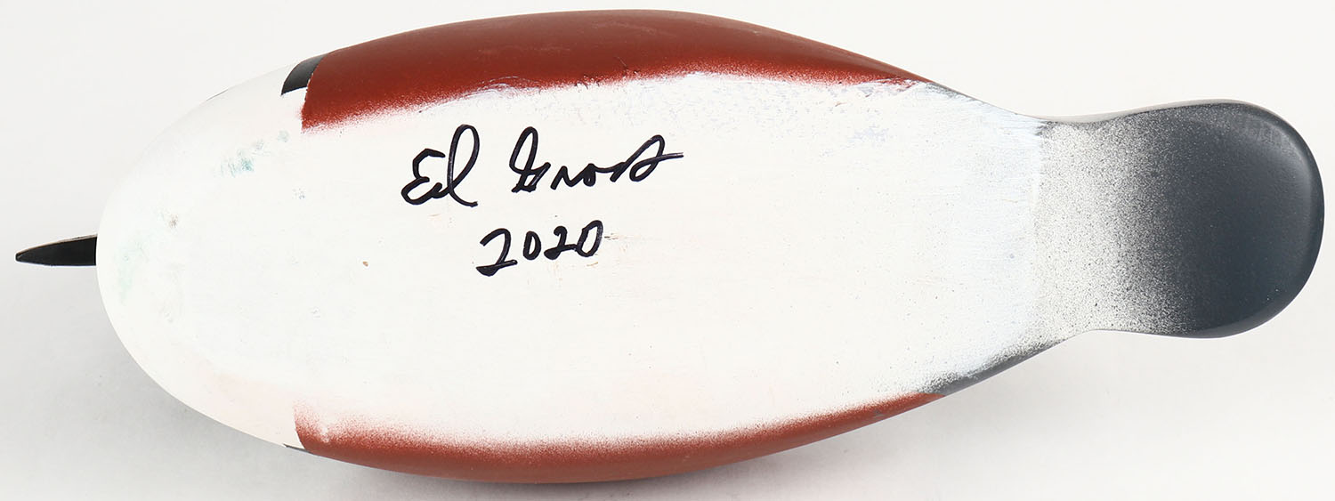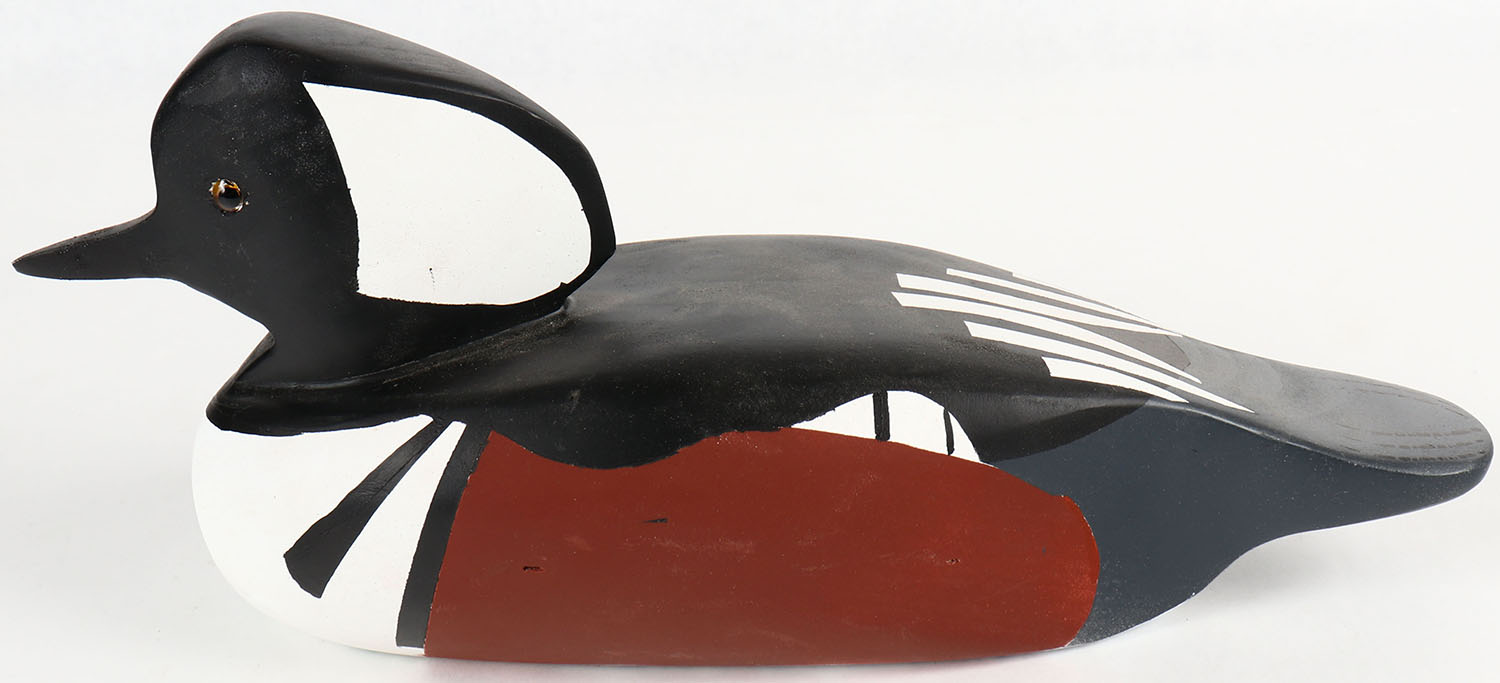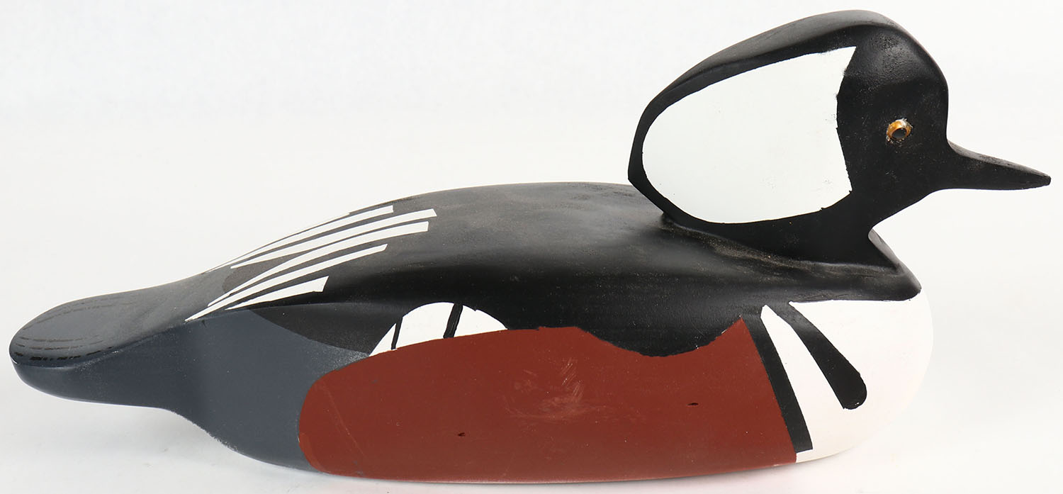 Hooded Merganser by Ed Gross, GE, solid wood, original paint, signed on bottom, 13'' OAL. Grade: Excellent ++ - Value: 30 to 90