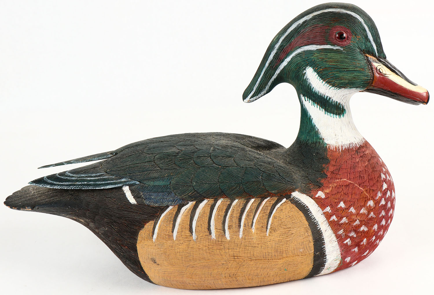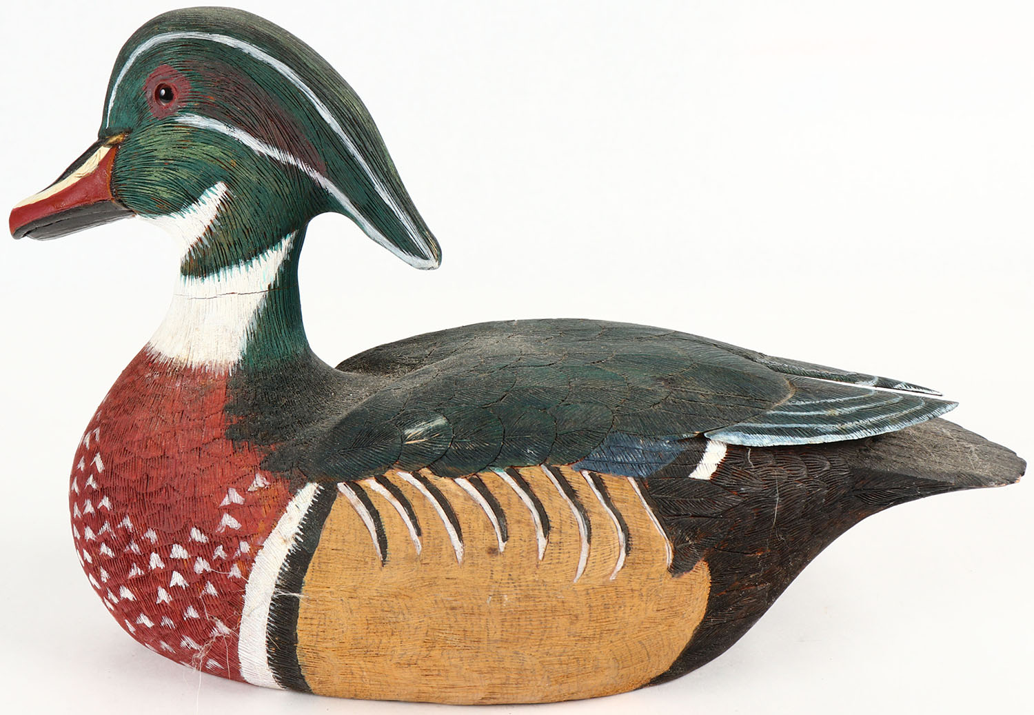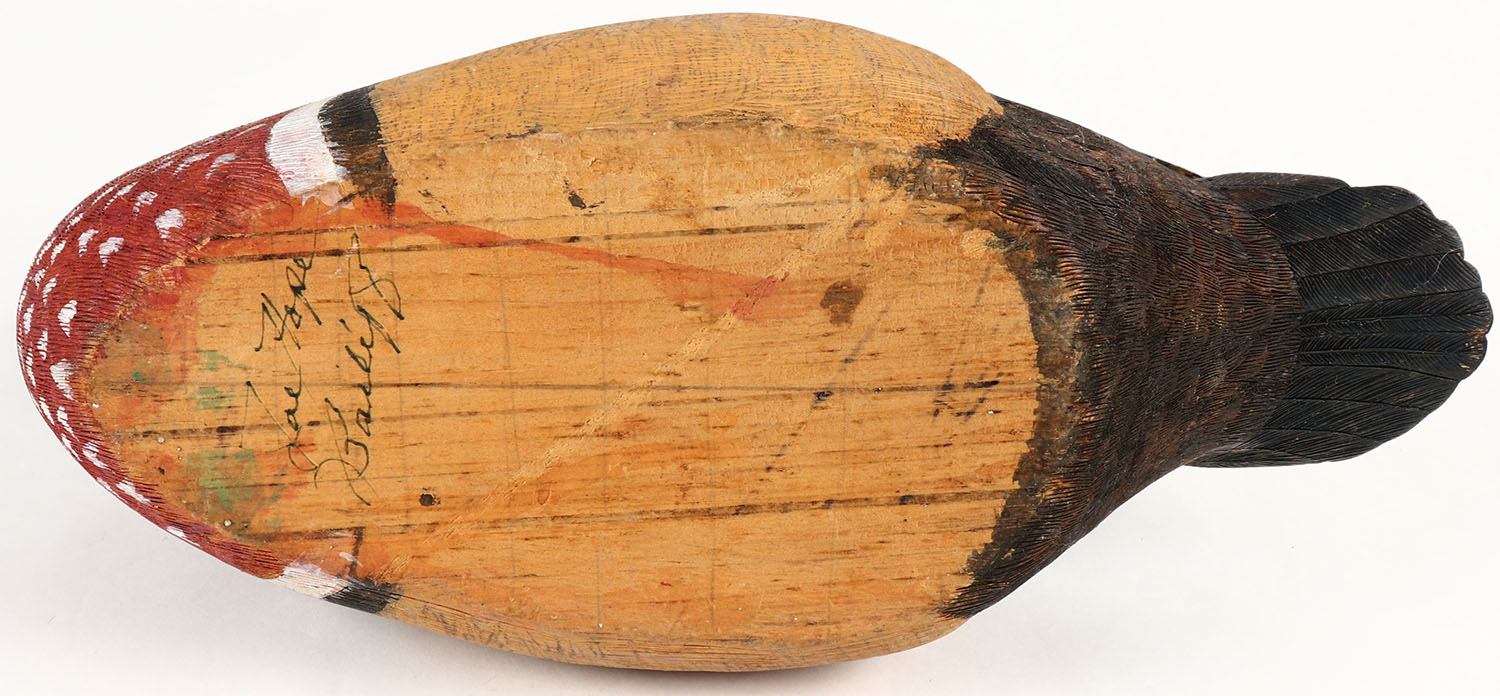Woodduck Drake by Jae Hope, GE, hollow wood, excellent original paint with feather detail, signed on bottom, 13'' OAL. Grade: Excellent ++ - Value: 20 to 60