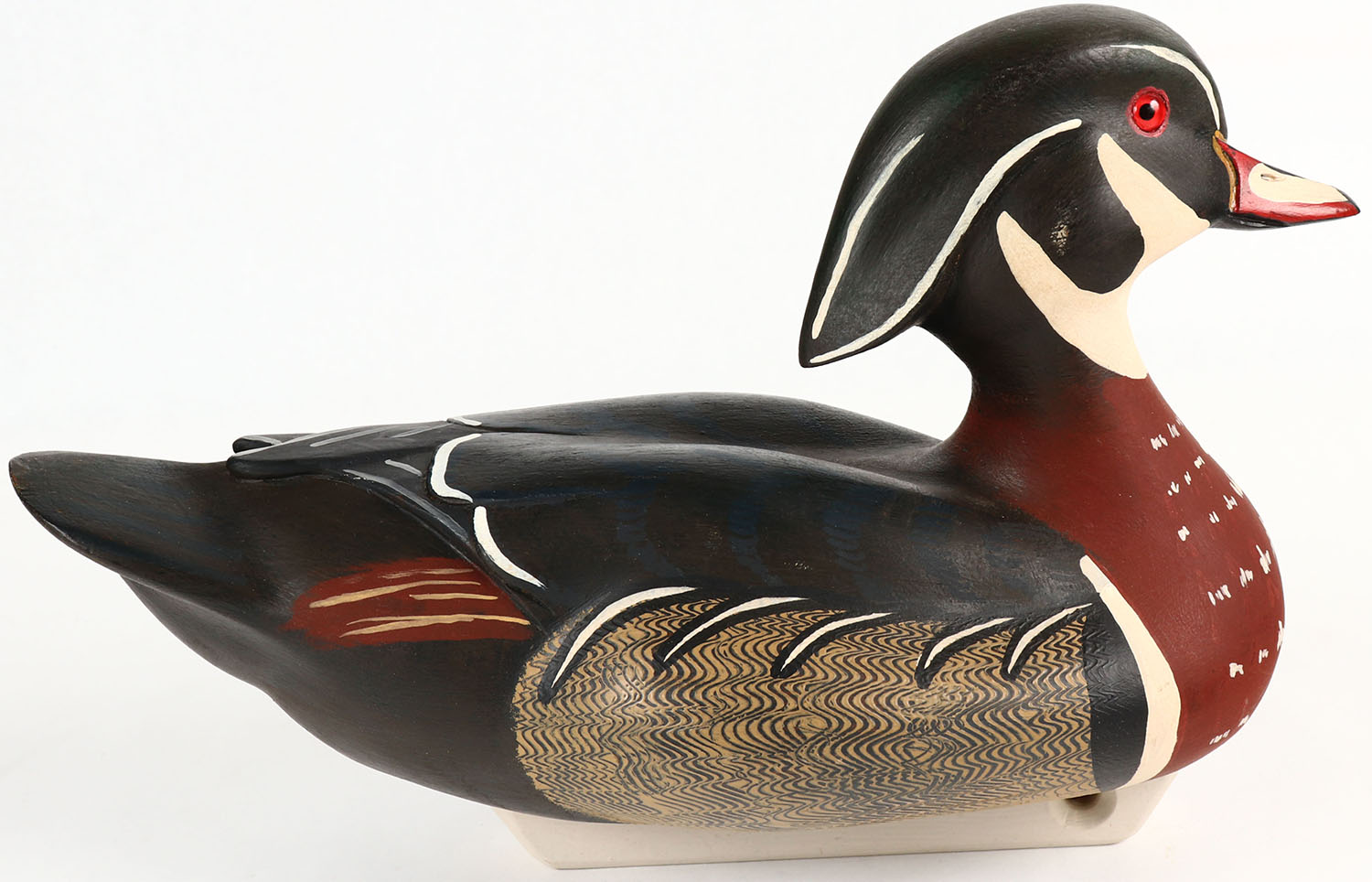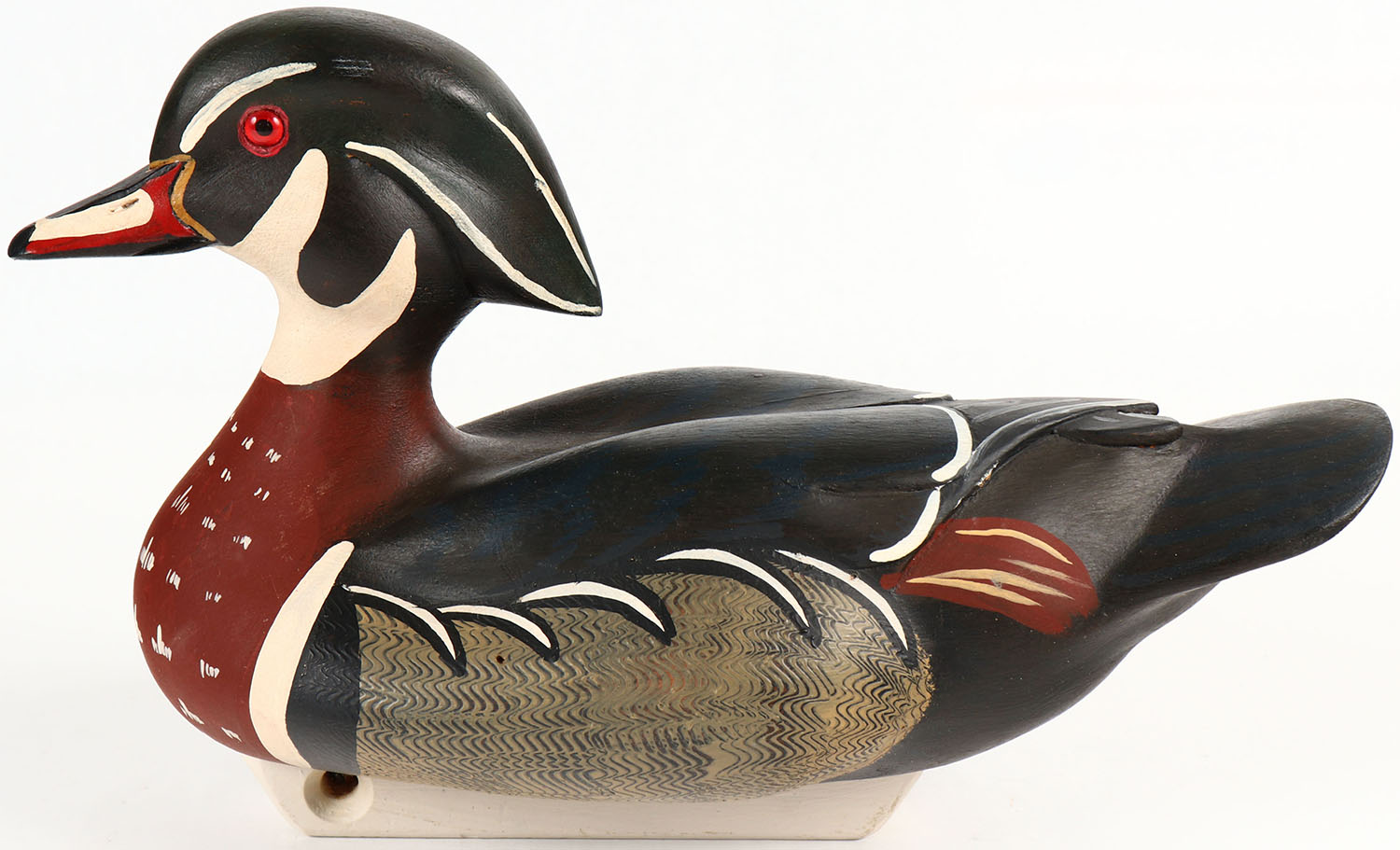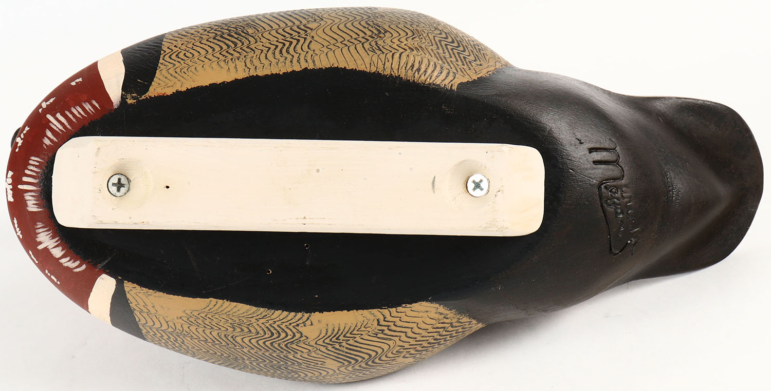 Woodduck Drake by M. Myer, GE, hollow wood, excellent original comb paint, branded on bottom, 13'' OAL. Grade: Excellent ++ - Value: 20 to 60