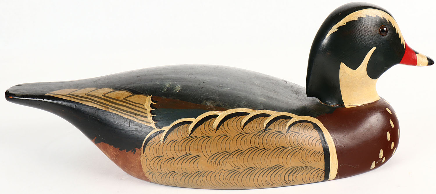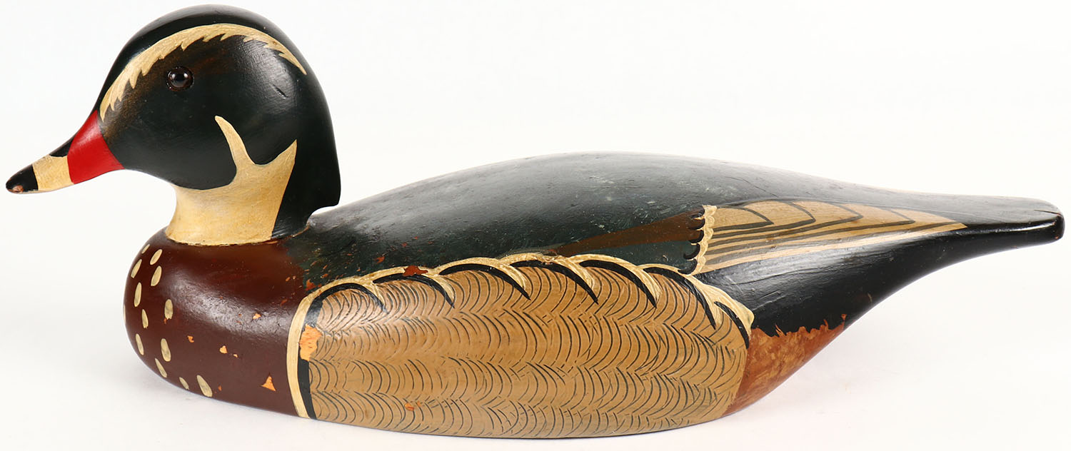 Woodduck Drake by unknown maker, GE, hollow wood, excellent original paint with feather detail, 14 1/2'' OAL. Grade: Excellent - Value: 20 to 60