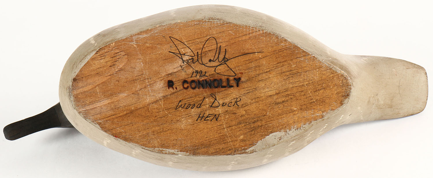 Woodduck Hen by R. Connolly, GE, solid wood, excellent original paint, signed & branded on bottom, 15'' OAL. Grade: Excellent - Value: 20 to 60