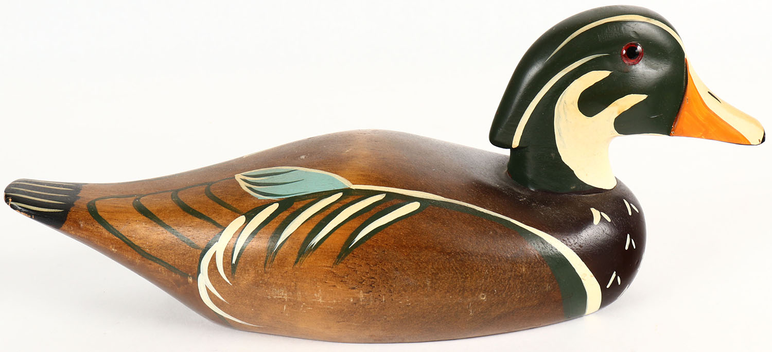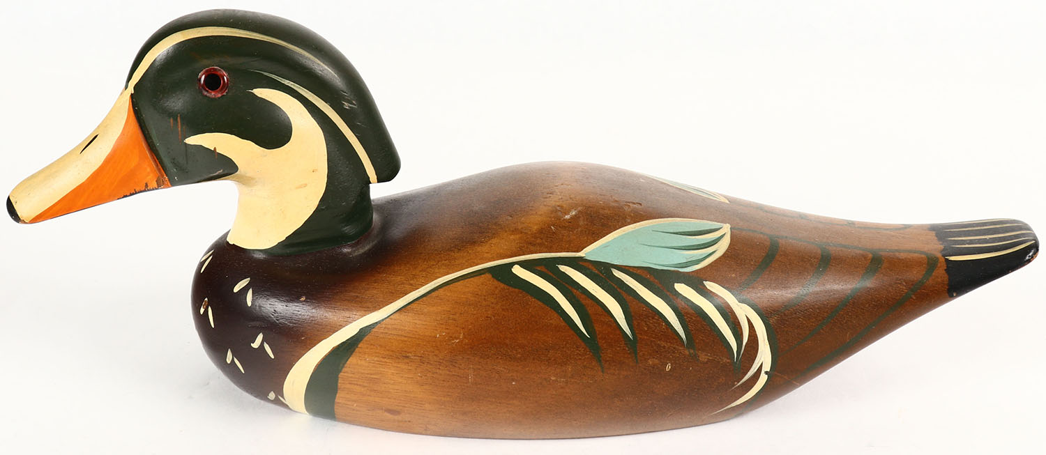 Woodduck Drake by unknown maker, GE, solid wood, excellent original paint, 13'' OAL. Grade: Excellent - Value: 20 to 60