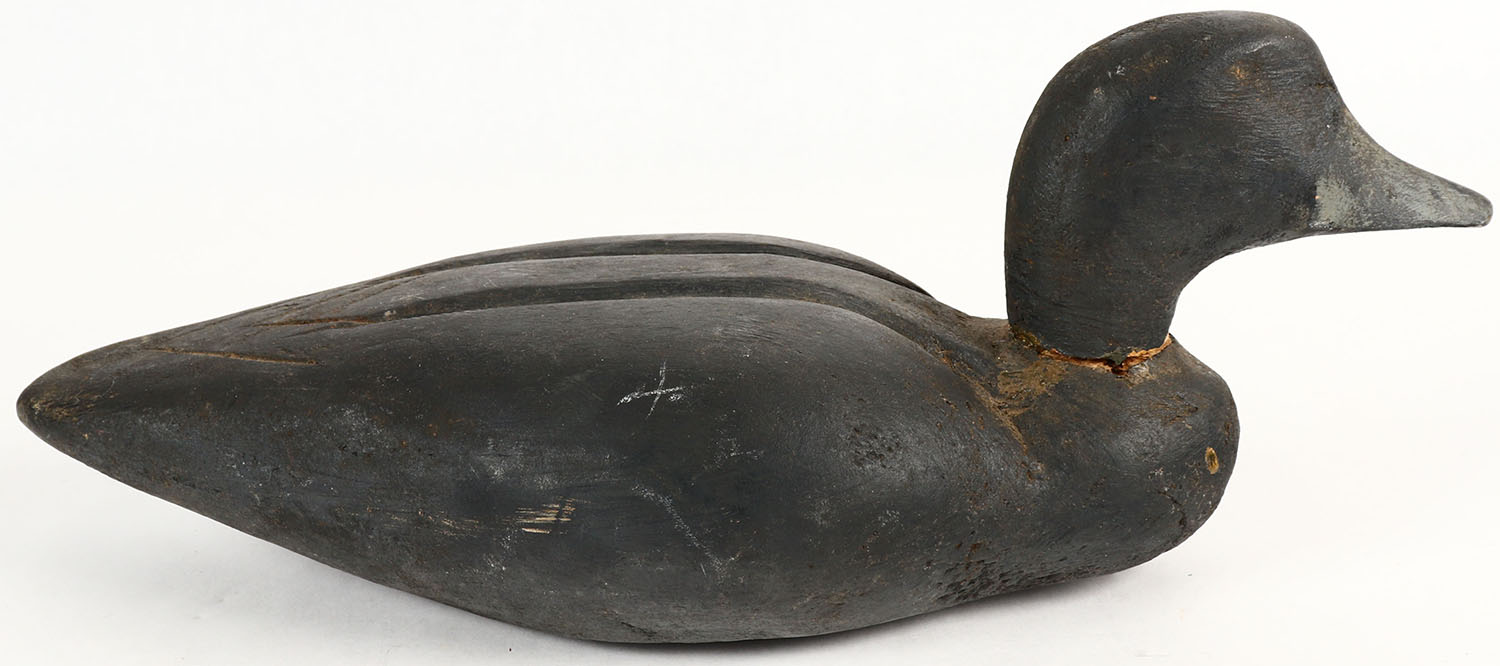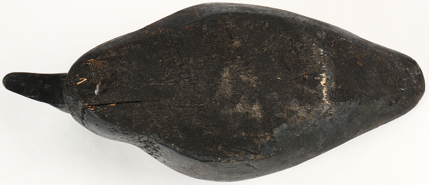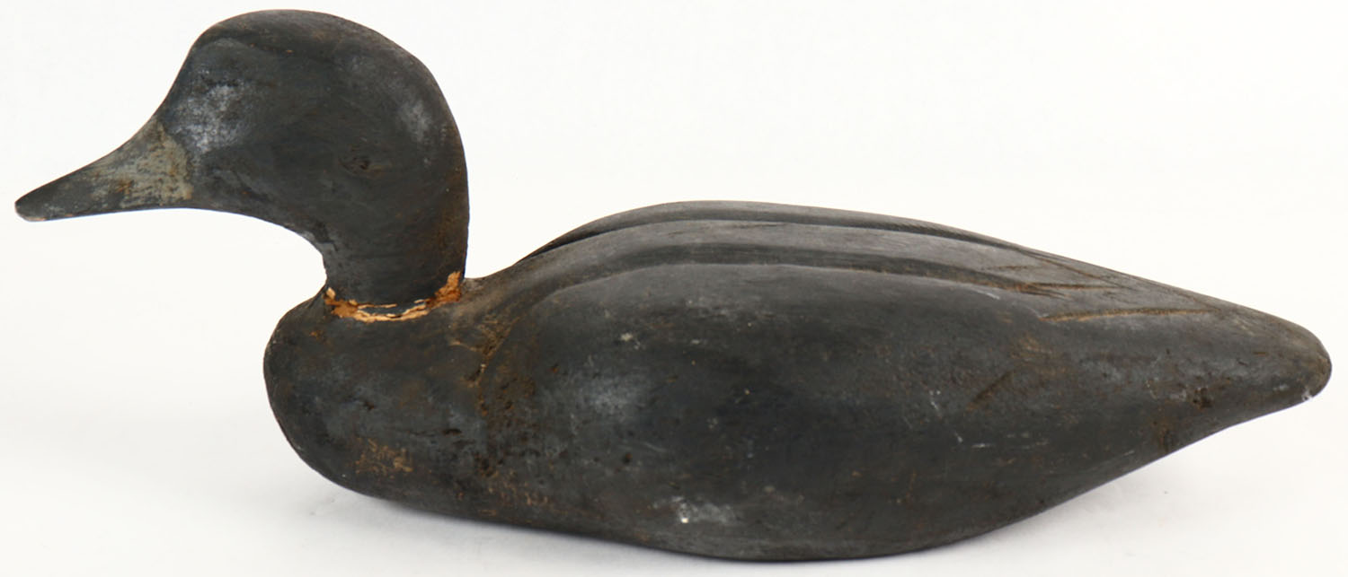 Bluebill Drake by unknown maker, no eyes, solid wood, original paint, 14'' OAL. Grade: Excellent - Value: 10 to 50