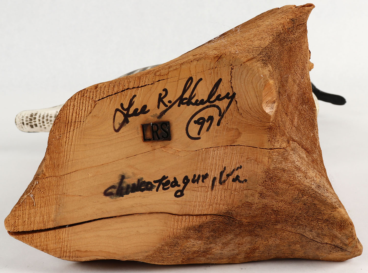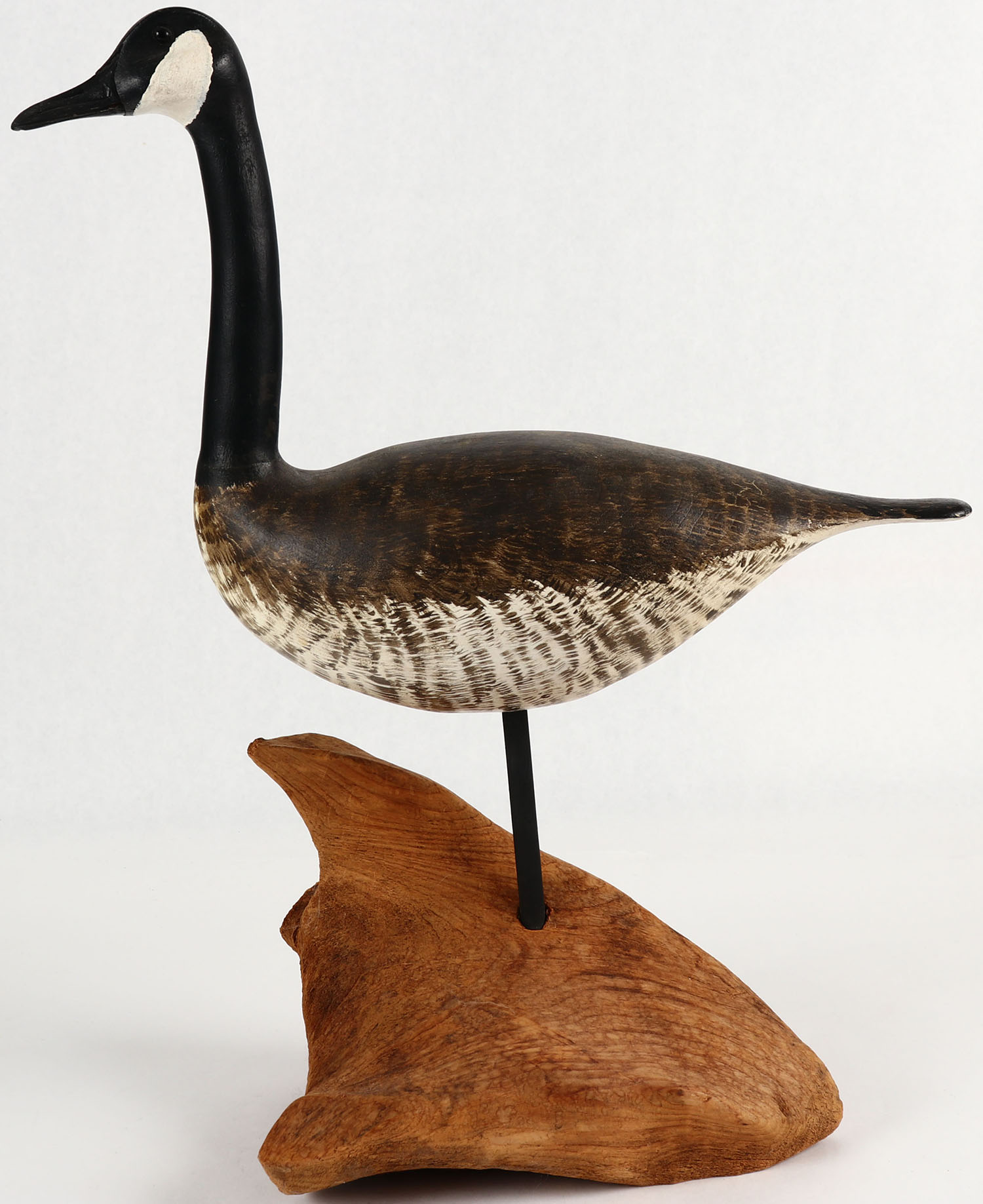 Miniature Canada Goose on stand by Lee R. Schceley, Chincoteague, Virginia, branded LRS & signed on bottom of stand & decoy, GE, solid wood, mint original paint, 13'' OAL. Grade: Excellent ++ - Value: 20 to 60