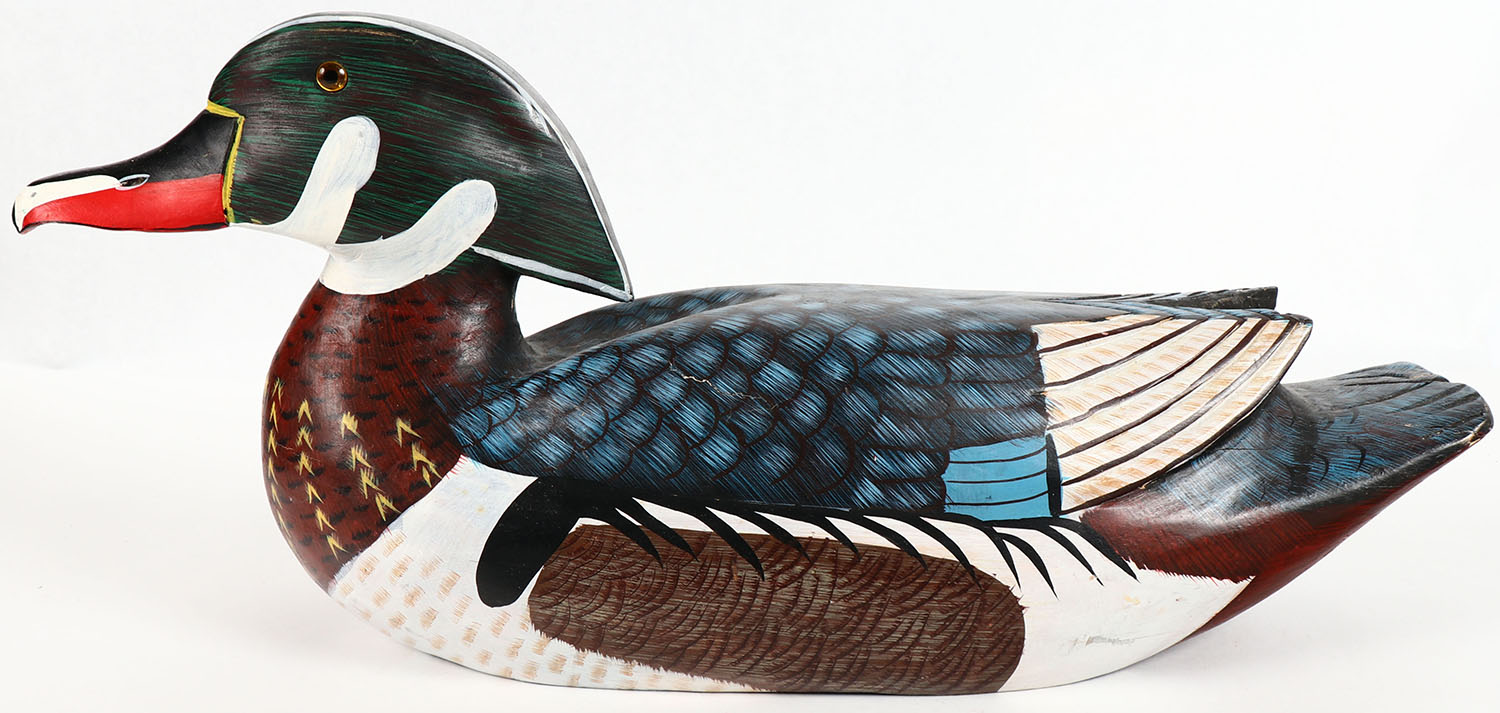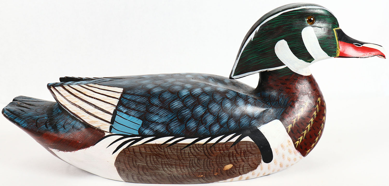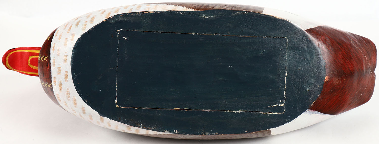 Woodduck Drake by unknown maker, GE, solid wood, original paint, has crack to tail, 19'' OAL. Grade: Very Good ++ - Value: 20 to 60