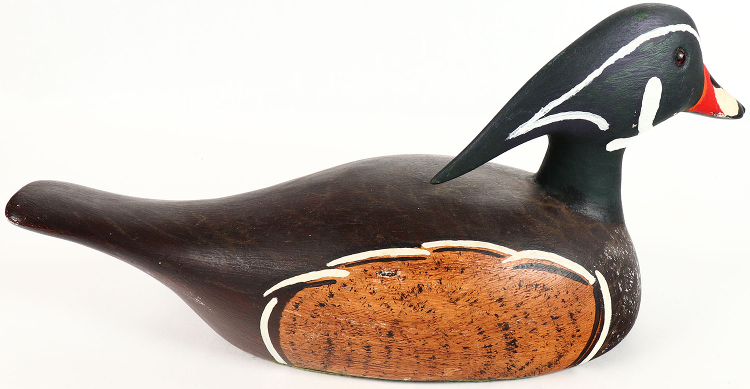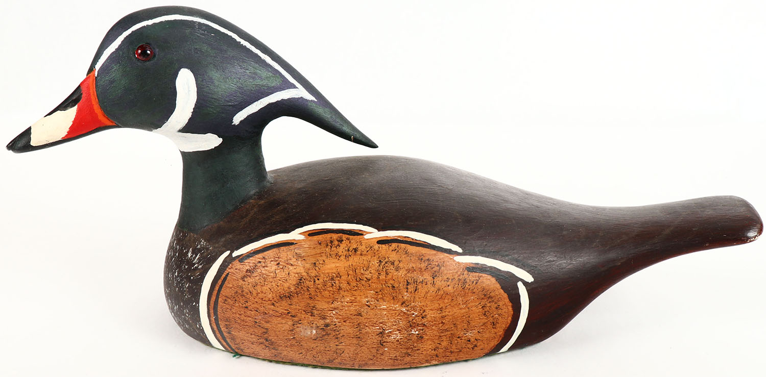 Woodduck Drake by Gord Tex, Cobourg, Ontario, GE, solid wood, original paint, 16'' OAL. Grade: Excellent ++ - Value: 20 to 60