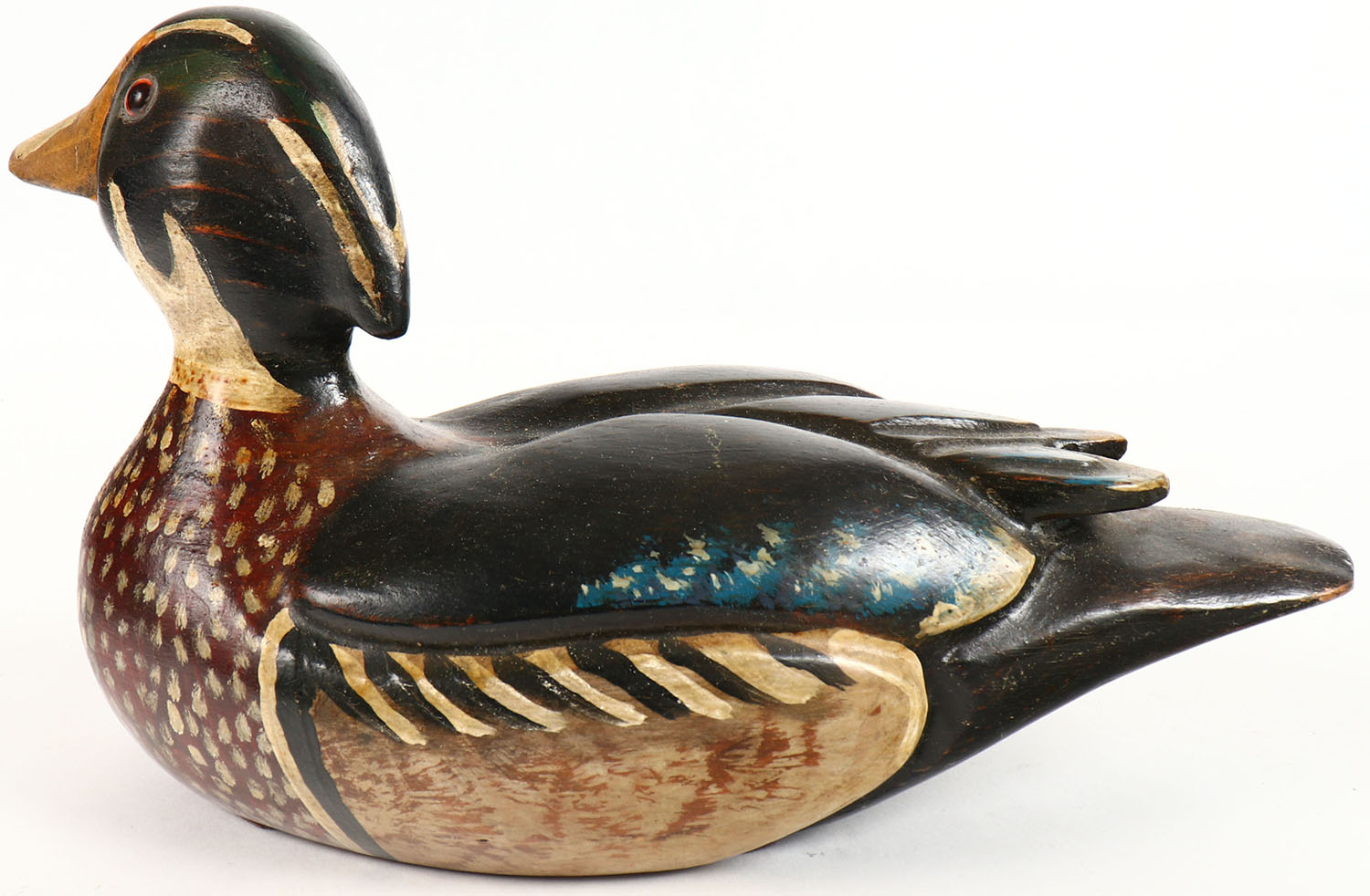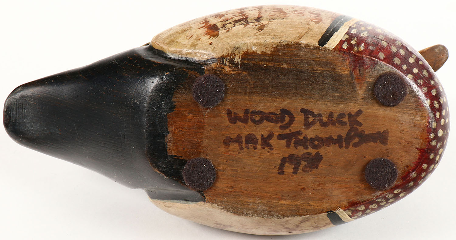 Woodduck Drake by Mak Thompson, GE, solid wood, original paint, 10 1/2'' OAL. Grade: Excellent - Value: 20 to 60