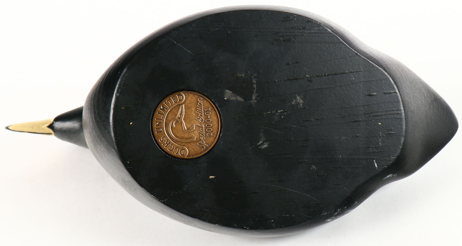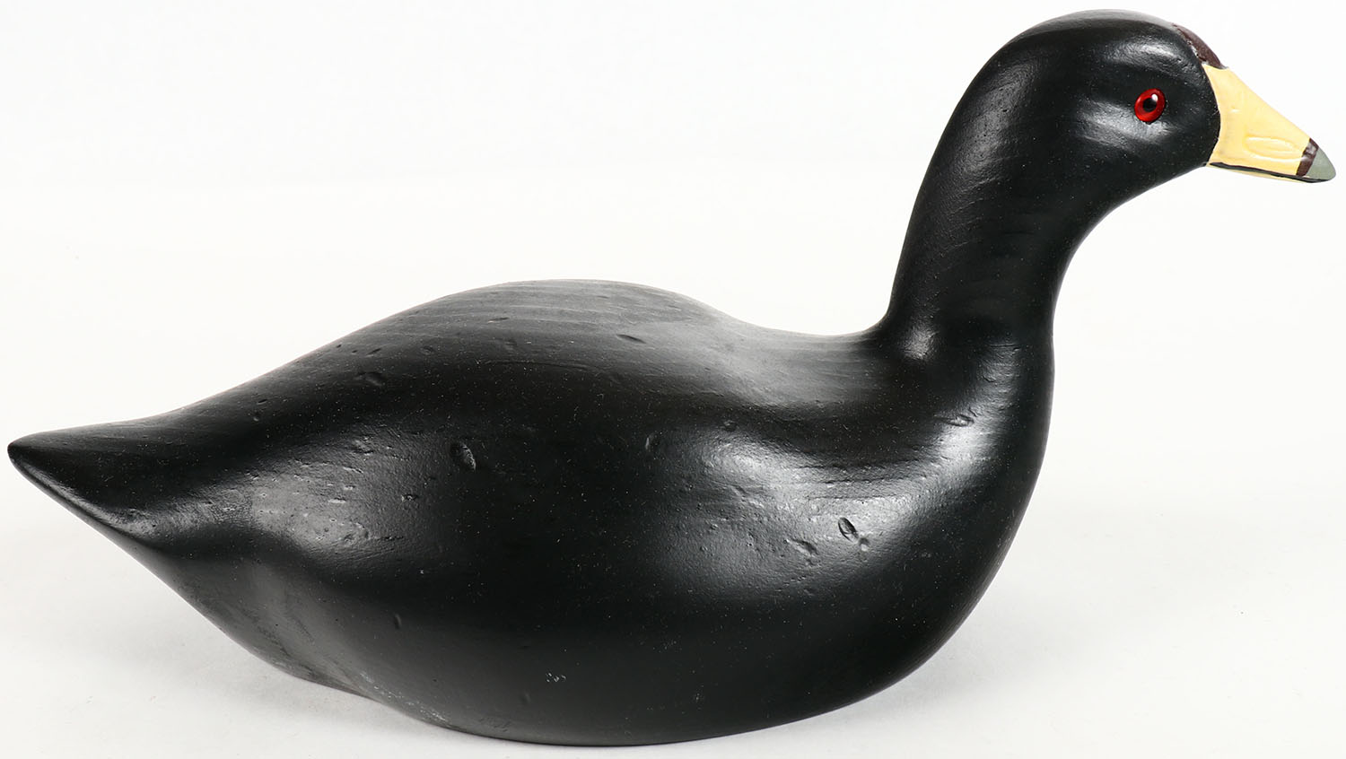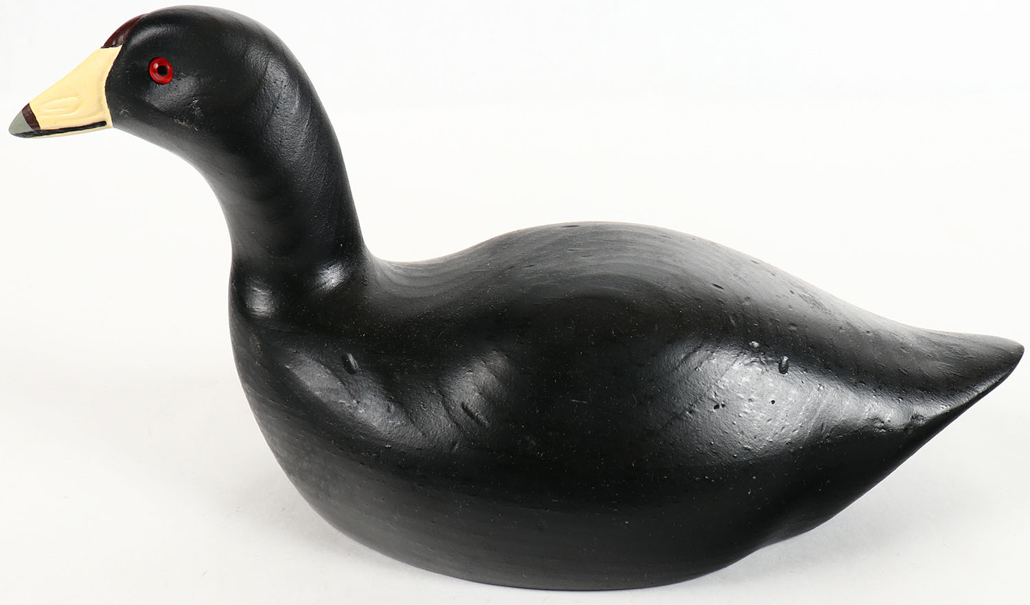 Coot by DU with coin, GE, solid wood, original paint, 11 1/2'' OAL. Grade: Excellent - Value: 20 to 60