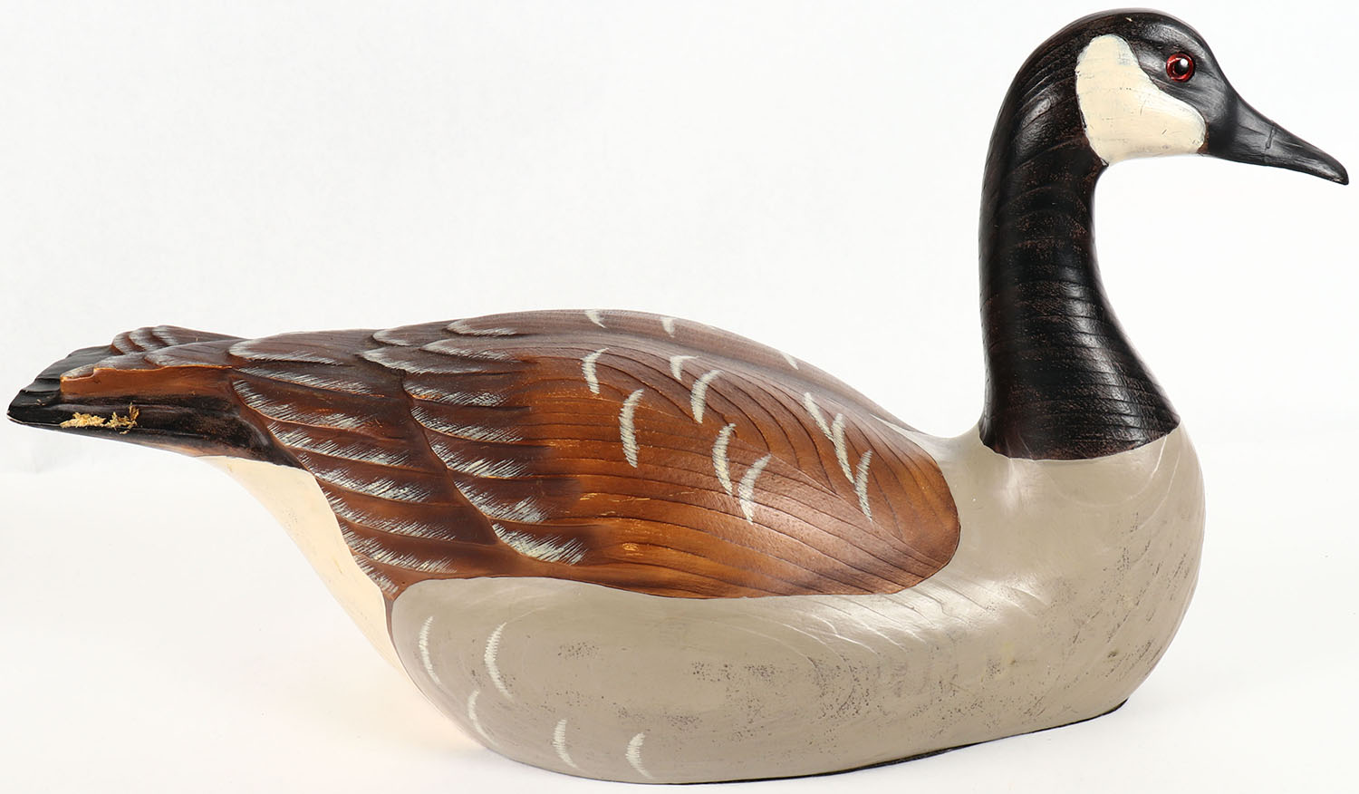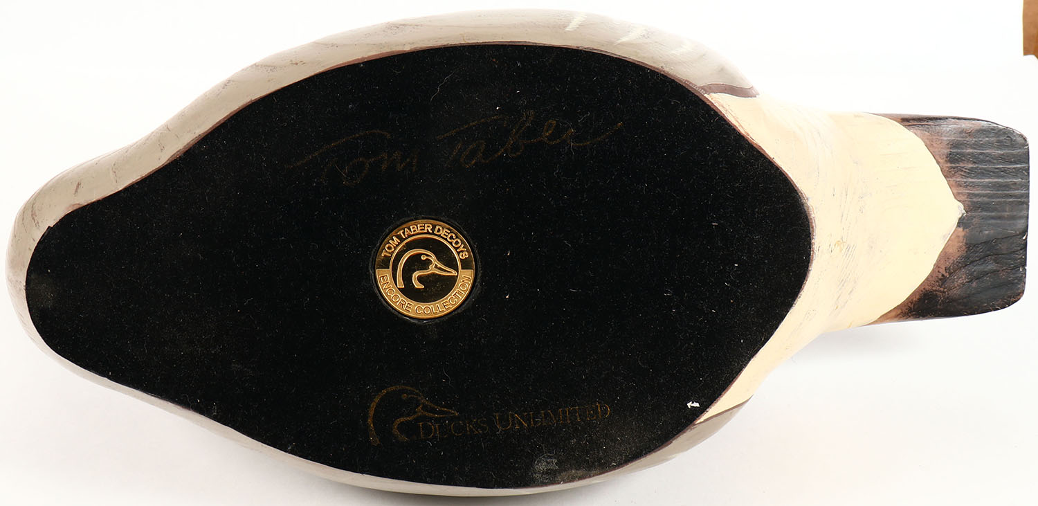 Canada Goose by Tom Taber, has gold DU coin, GE, solid wood, original paint, 20'' OAL. Grade: Excellent - Value: 30 to 100