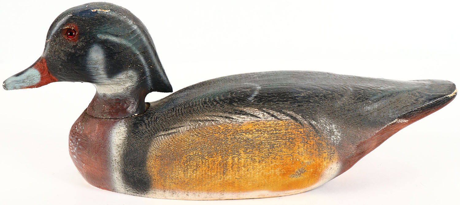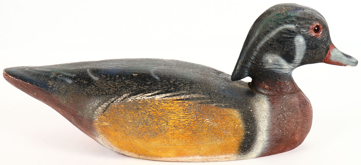 Woodduck Drake by Herters Decoy Co., Waseca, MN, 1893 series, glass eyes, solid wood, original paint, structurally excellent, unmarked on bottom. Grade: Excellent ++ - Value: 50 to 200