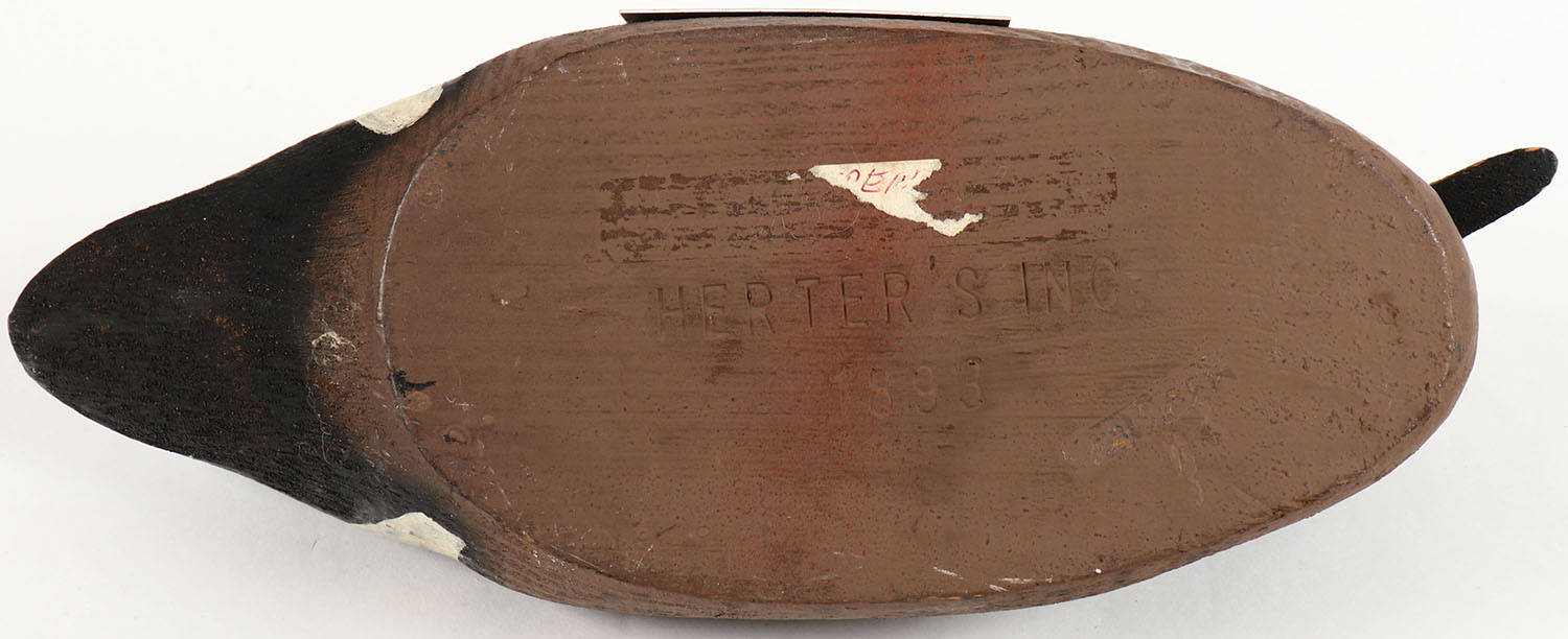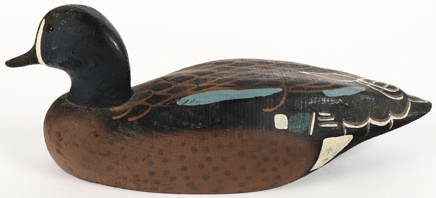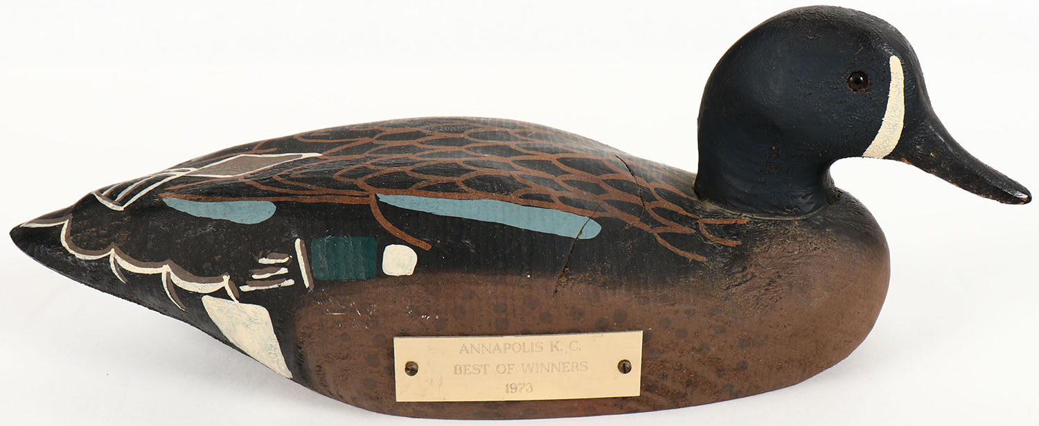 Bluewing Teal Drake by Herters, Waseca, MN, GE, solid wood, original paint, structurally excellent, marked on bottom, has brass tag on side ''BEST OF WINNERS'', 12'' OAL. Grade: Excellent ++ - Value: 50 to 150