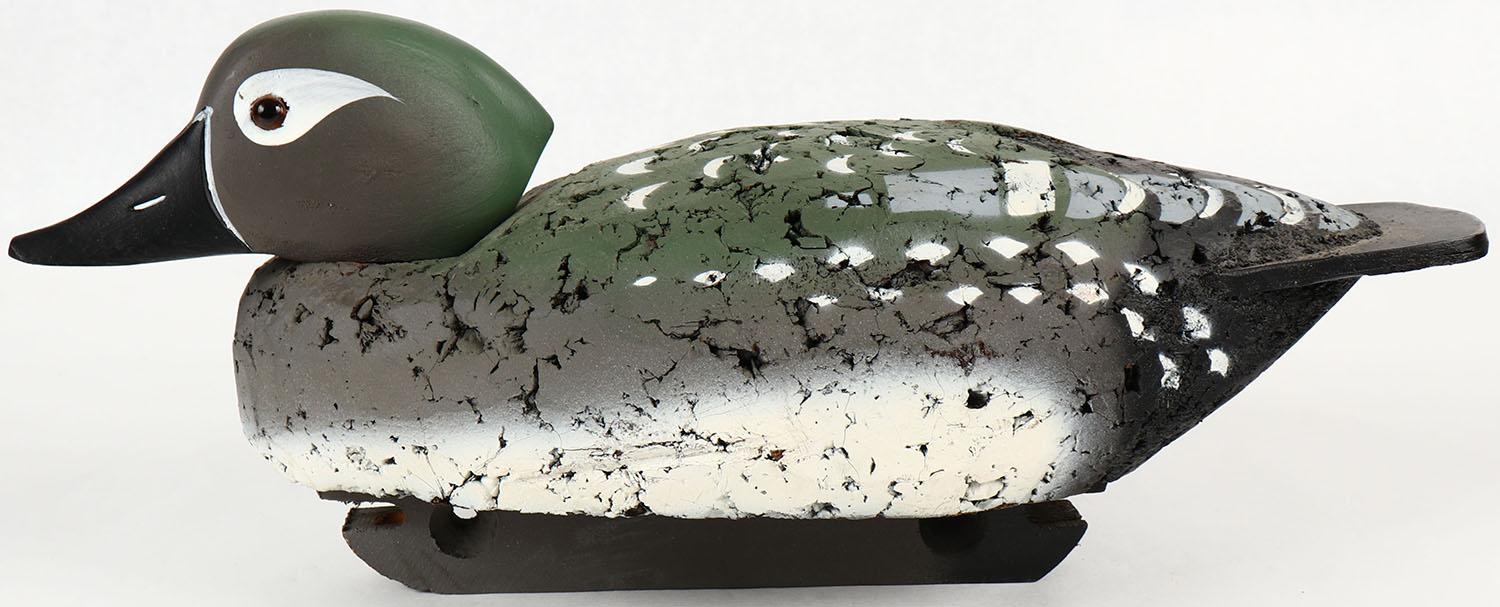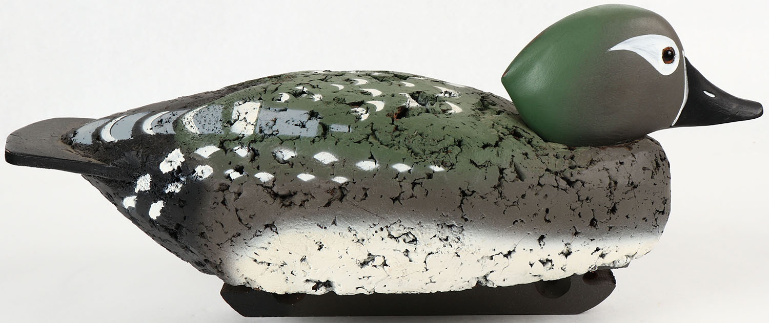 Woodduck Hen by LL Bean, marked on keel, glass eyes, solid cork body, wood head, original paint, structurally excellent. Grade: MINT - Value: 30 to 60