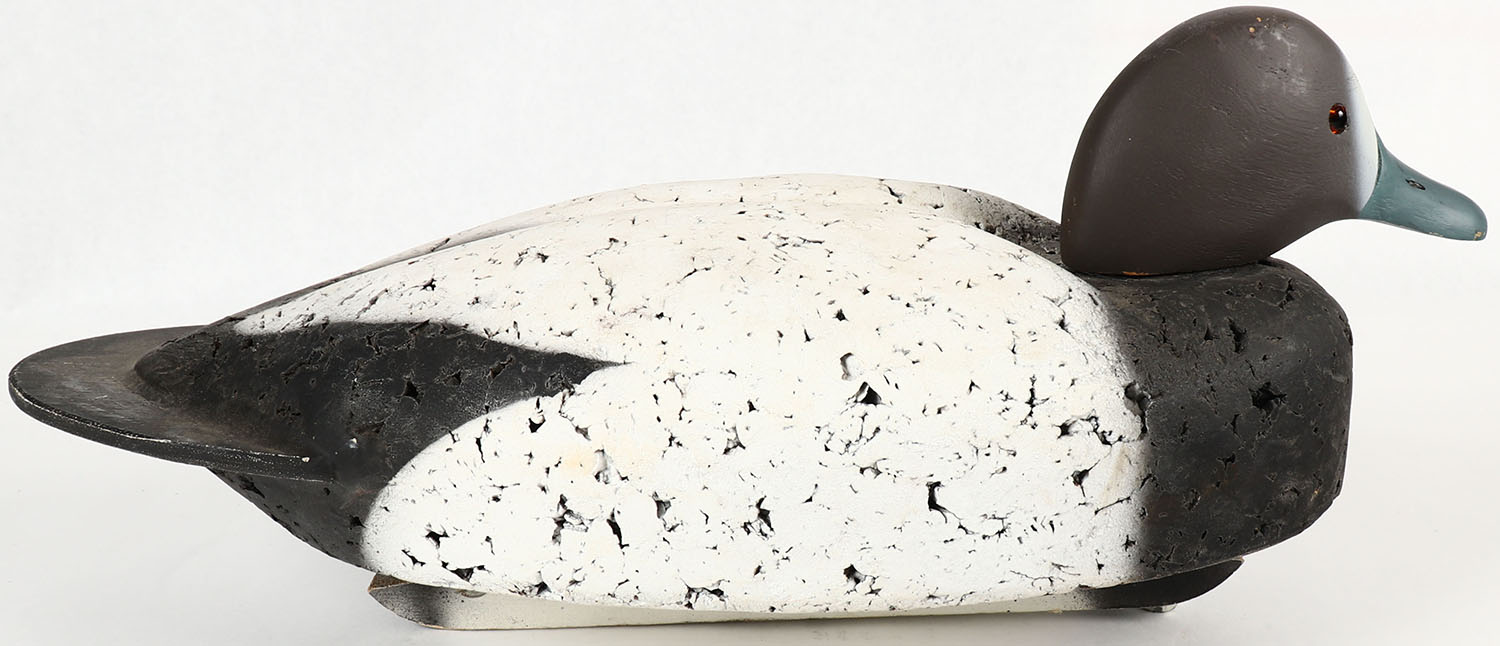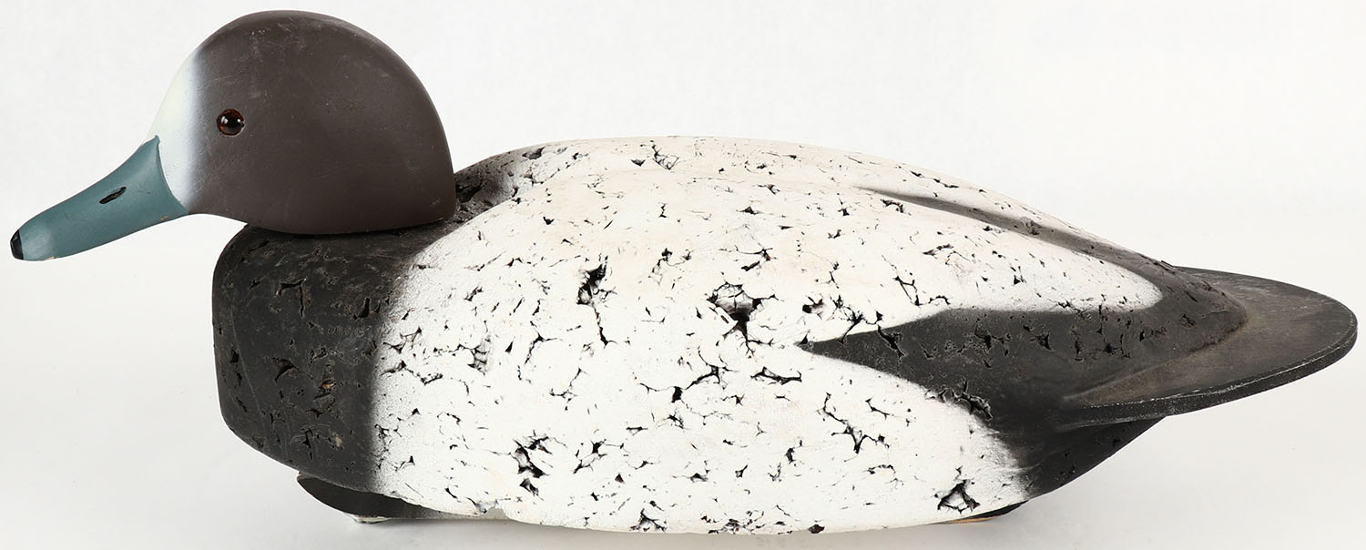 Bluebill Hen by LL Bean, marked on keel, glass eyes, solid cork body, wood head, original paint, structurally excellent, 18'' OAL. Grade: MINT - Value: 30 to 60
