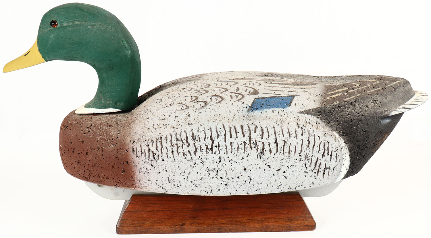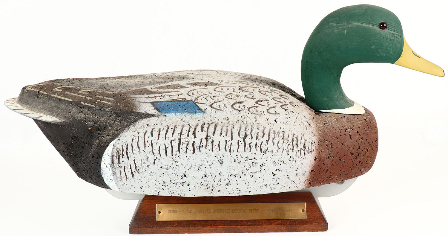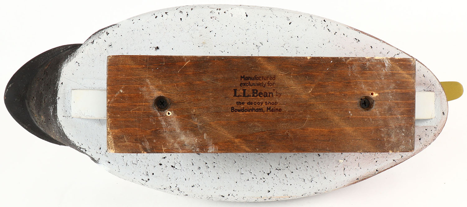 Mallard Drake by LL Bean, marked on keel, glass eyes, solid cork body, wood head, original paint, structurally excellent, 20'' OAL. Grade: MINT - Value: 30 to 60