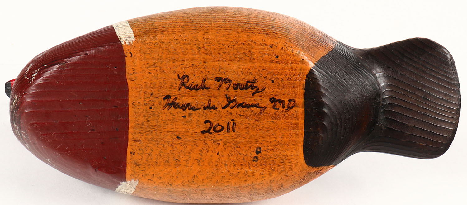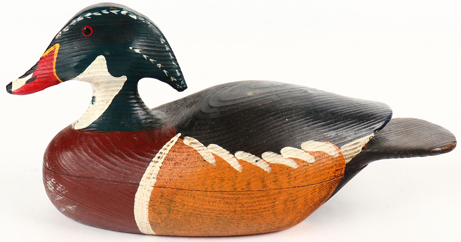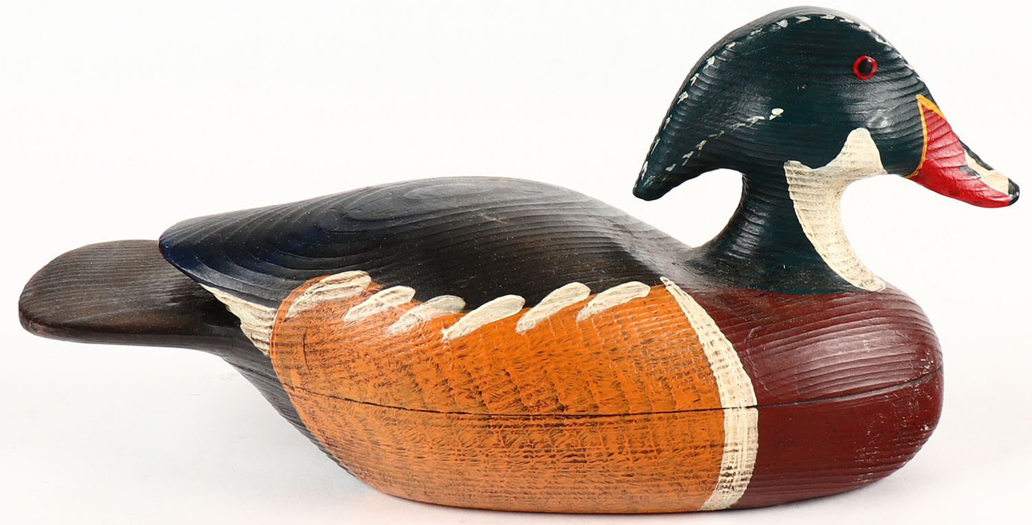 Miniature Woodduck Drake by Rich M. Haver de Grace MD, solid wood, original paint, 8'' OAL. Grade: Excellent - Value: 20 to 60