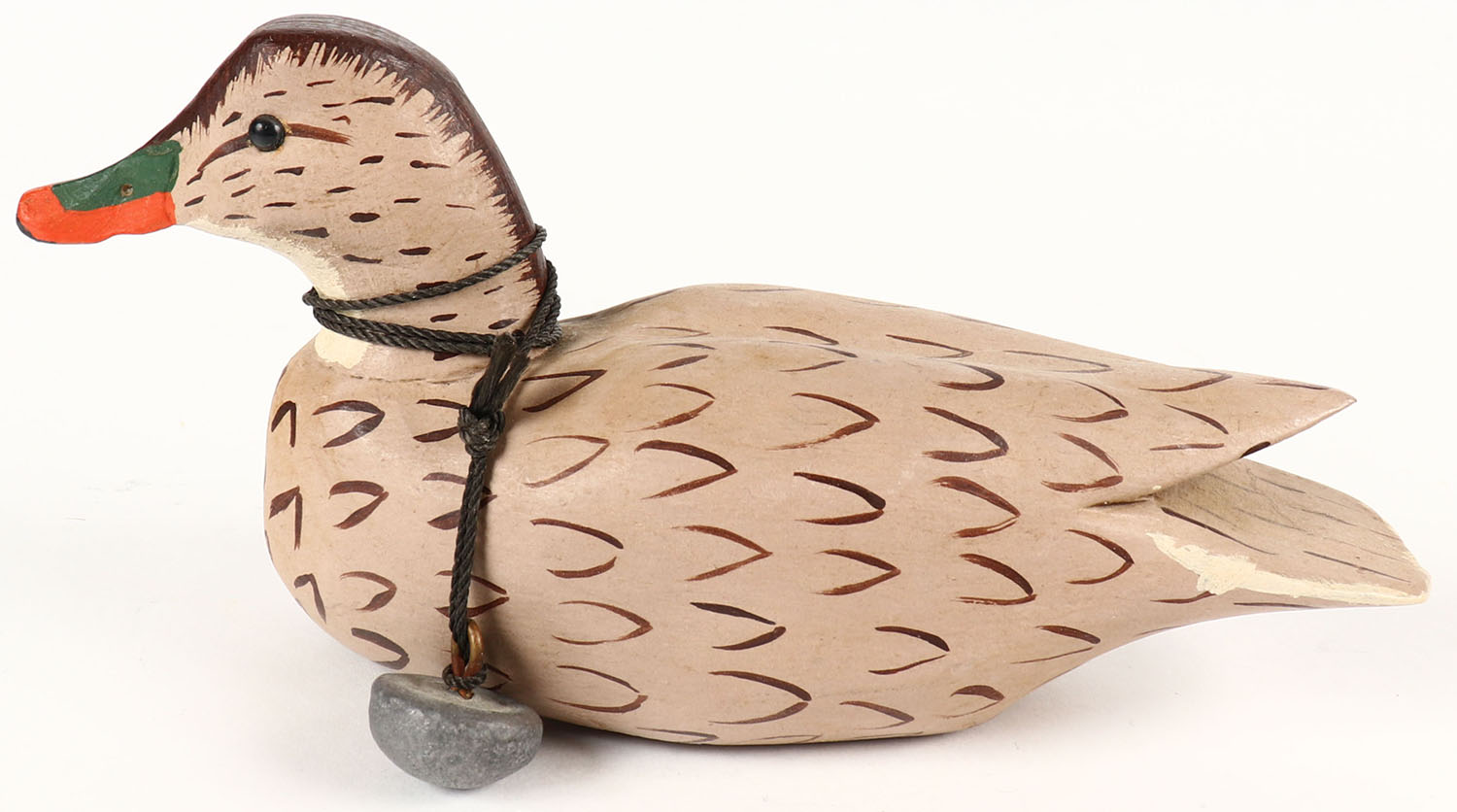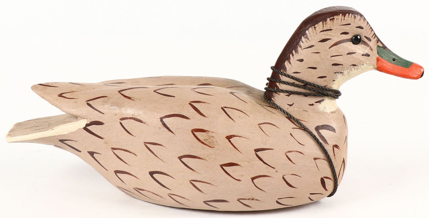 Miniature Mallard Hen by Charles Fish, solid wood, original paint, 7 1/2'' OAL. Grade: Excellent - Value: 20 to 60