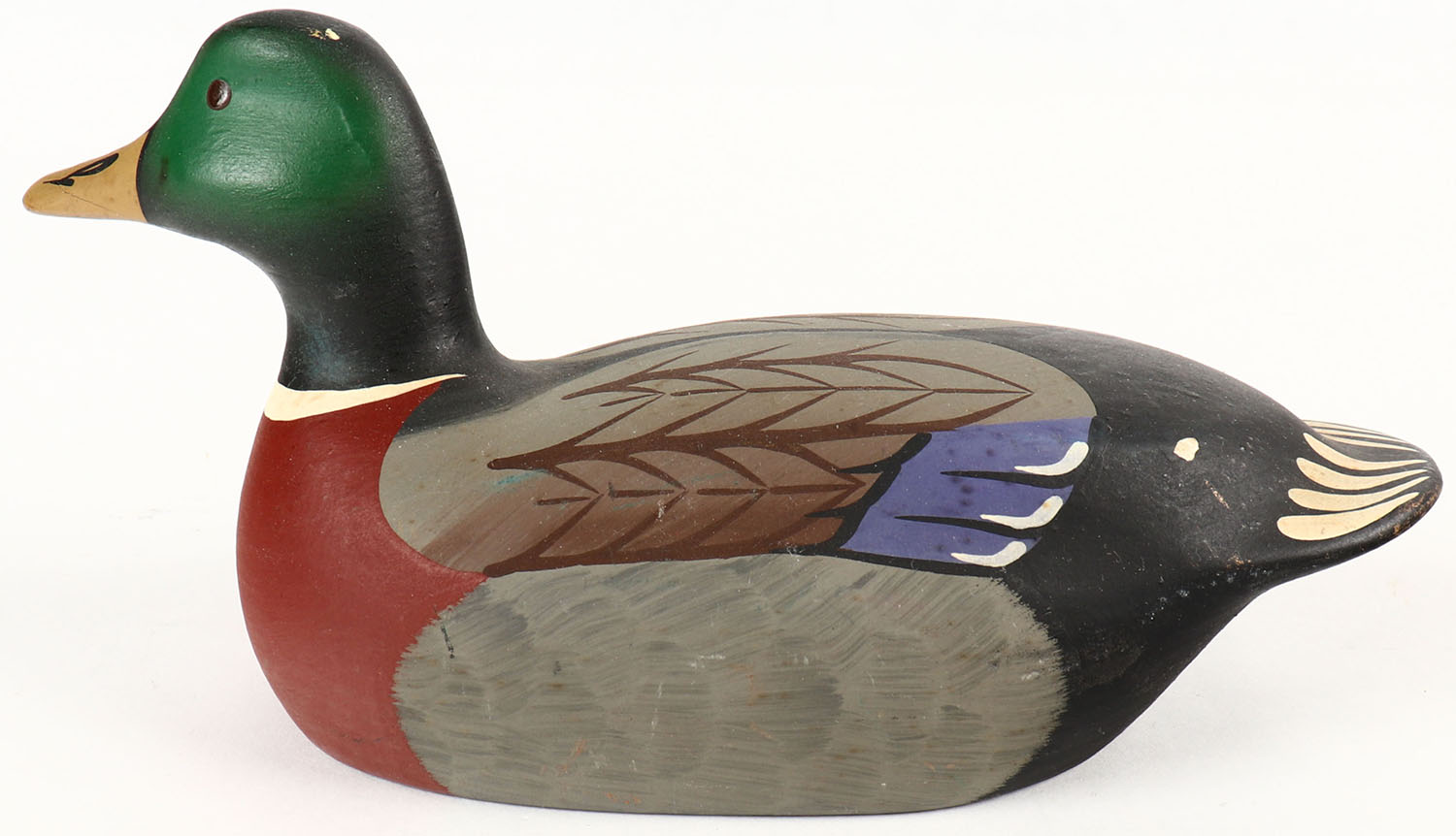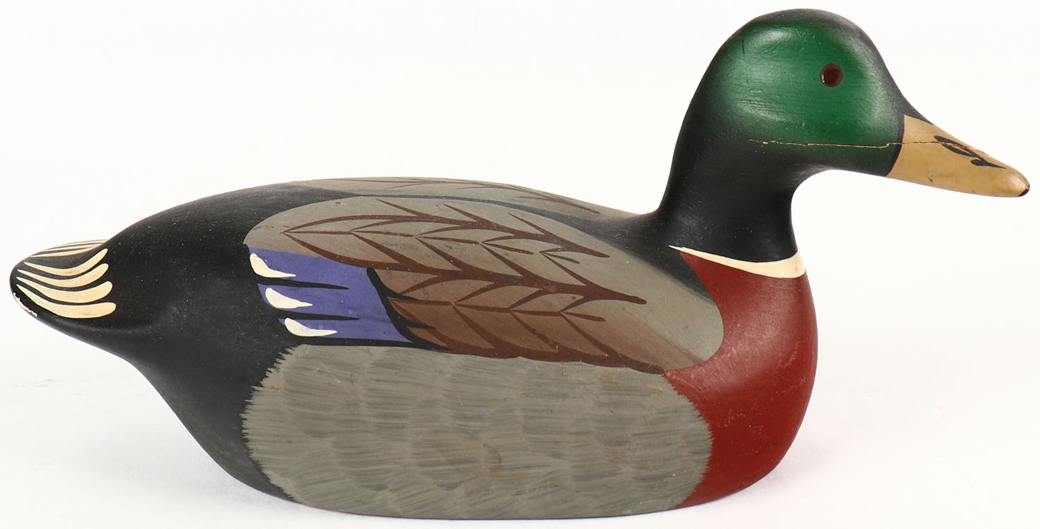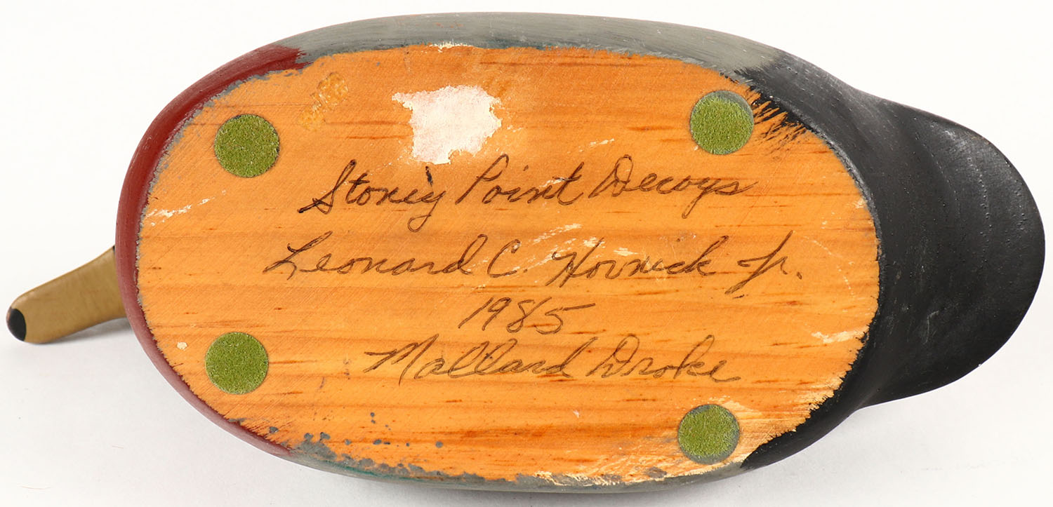 Miniature Mallard Drake by Leonard C. Houwick Jr, Stony Point Decoys, solid wood, original paint, 7 1/2'' OAL. Grade: Excellent - Value: 20 to 60