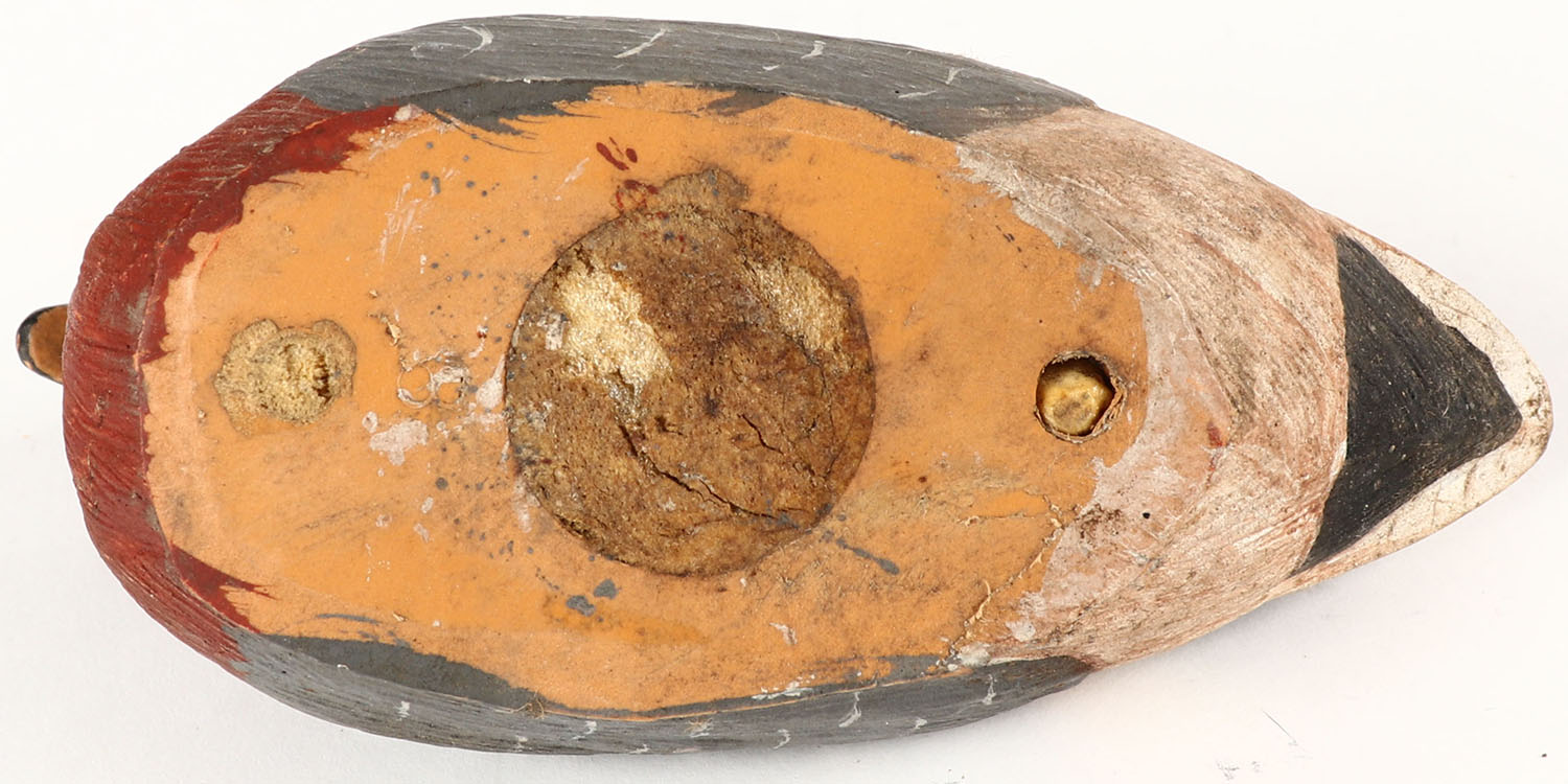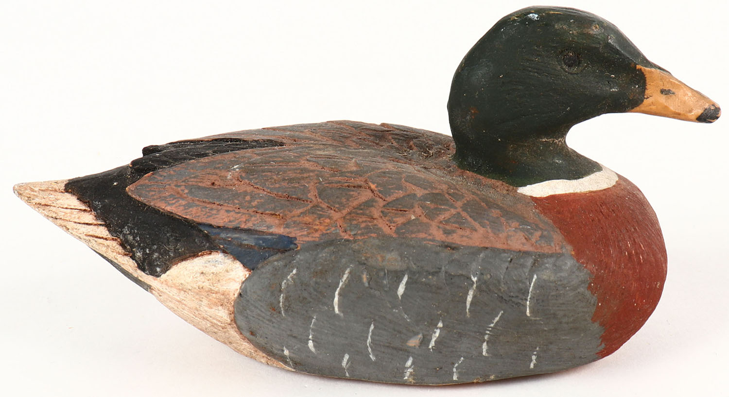 Miniature Mallard Drake by unknown maker, solid wood, original paint, 5'' OAL. Grade: Excellent - Value: 10 to 30
