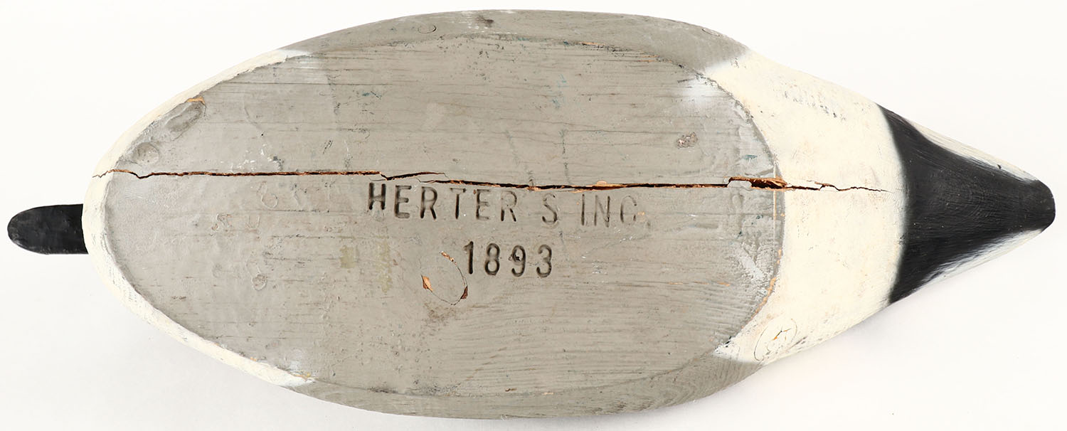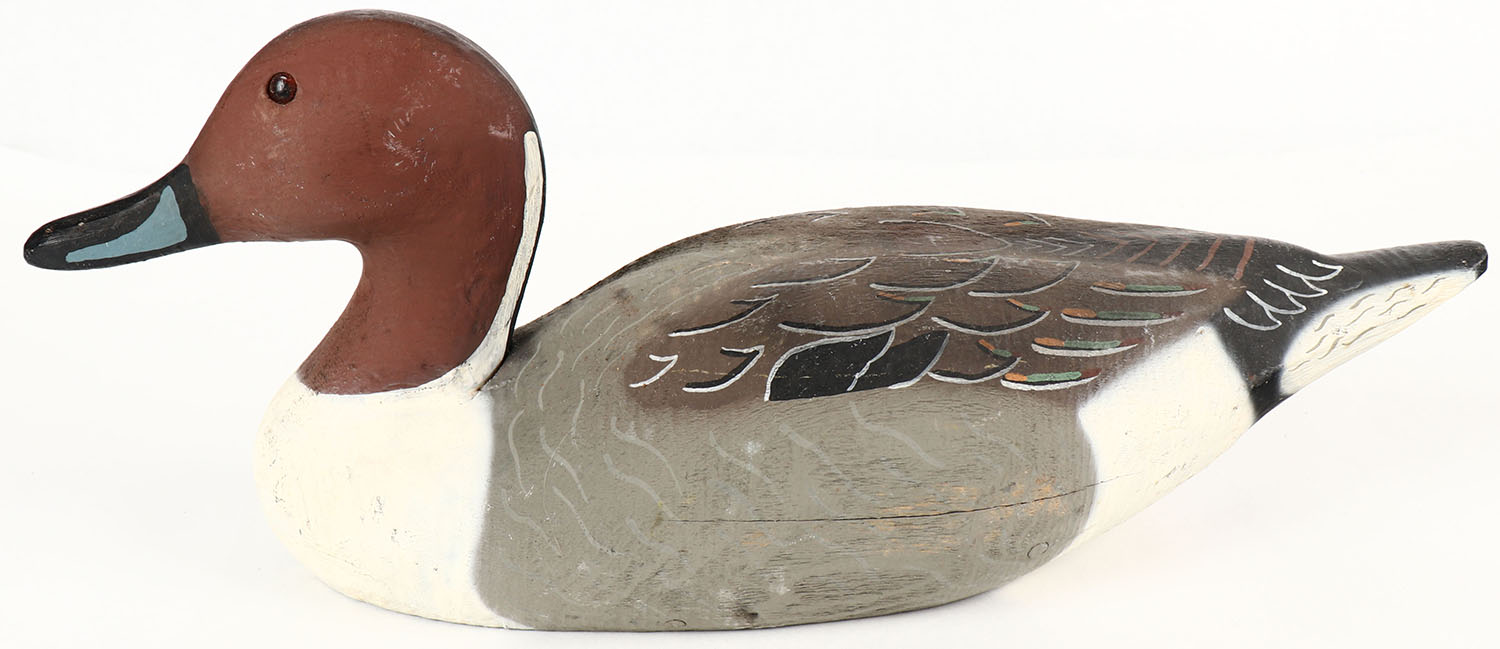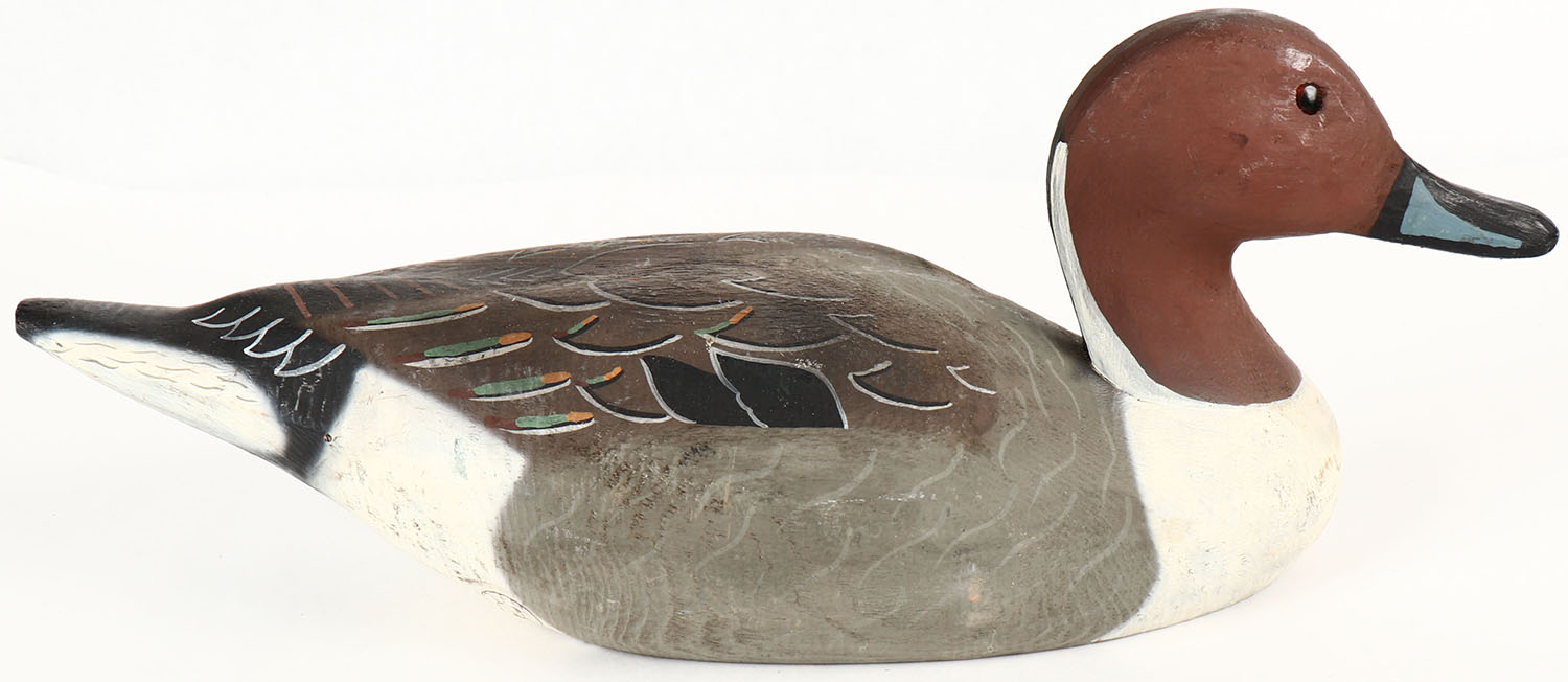 Pintail Drake by Herters Decoy Co., Waseca, MN, 1893 series, glass eyes, solid wood, original paint, structurally excellent, marked on bottom. Grade: Excellent ++ - Value: 40 to 100