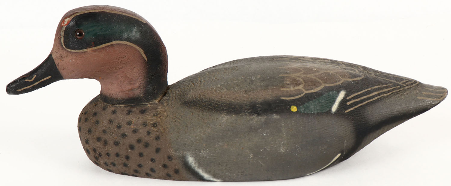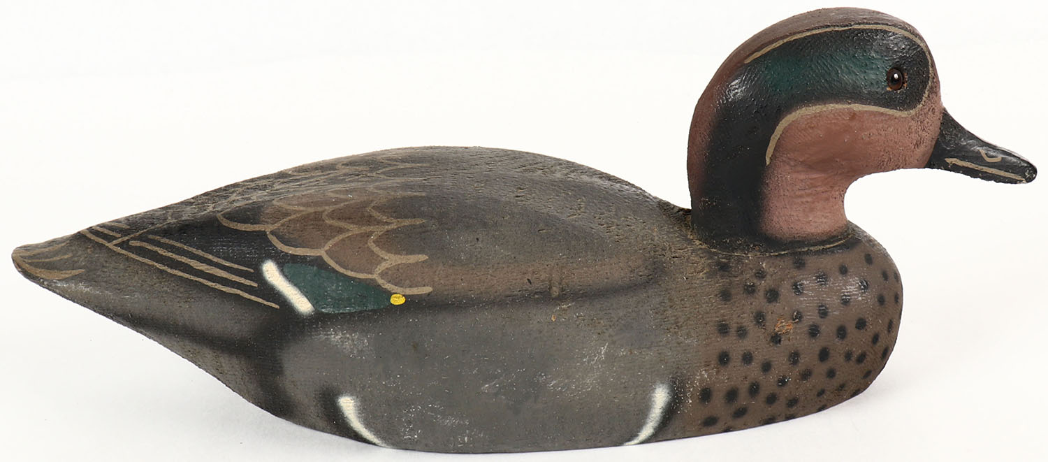 Greenwing Teal Drake by Herters Decoy Co., Waseca, MN, 1893 series, glass eyes, solid wood, original paint, structurally excellent, unmarked on bottom. Grade: Excellent ++ - Value: 40 to 100