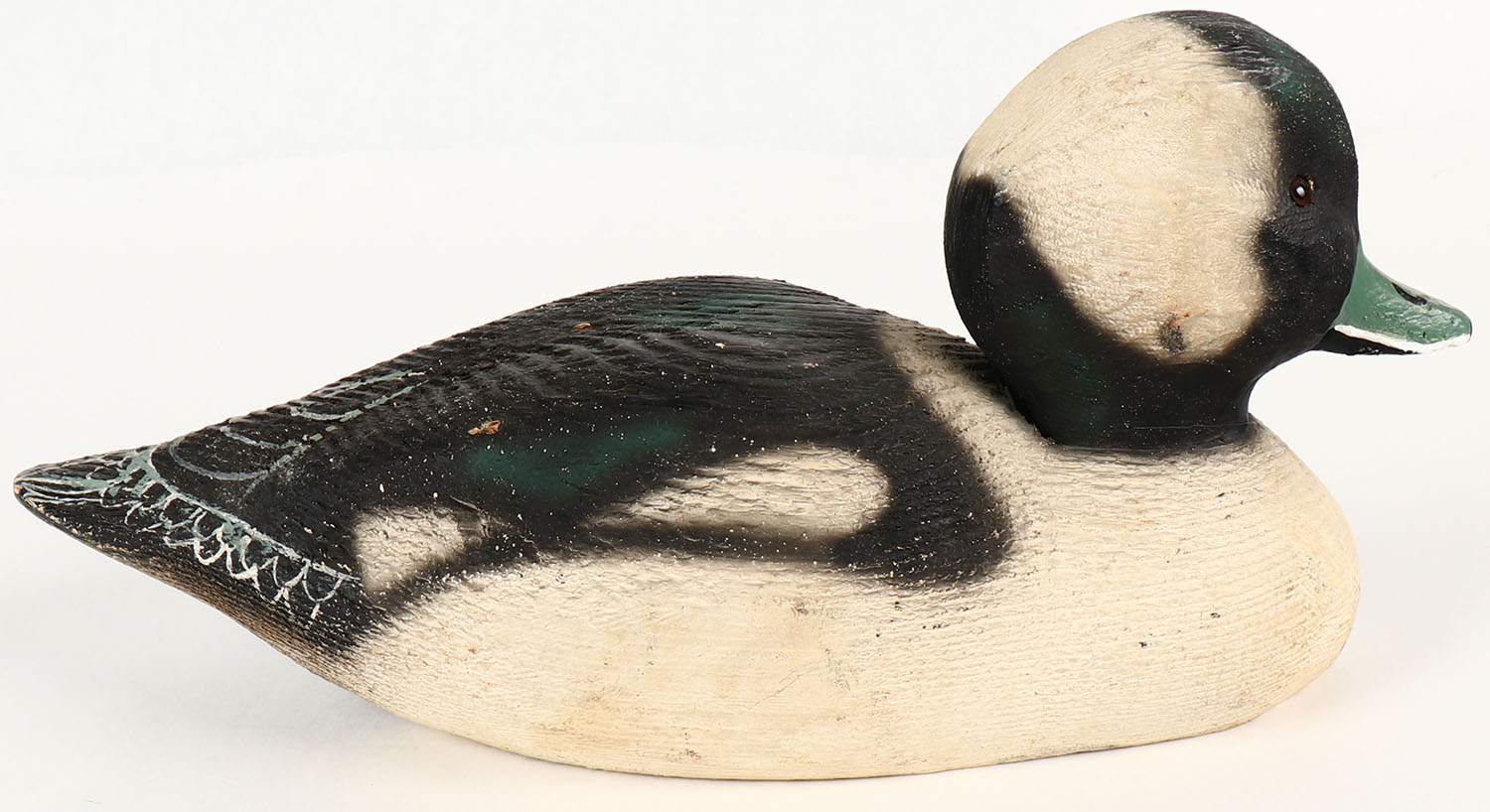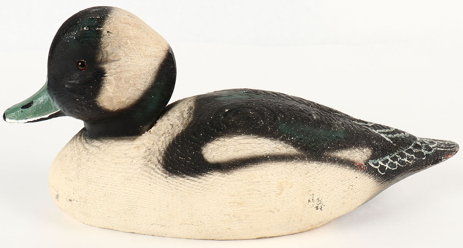 Bufflehead Drake by Herters Decoy Co., Waseca, MN, 1893 series, glass eyes, solid wood, original paint, structurally excellent, unmarked on bottom. Grade: Excellent ++ - Value: 40 to 100