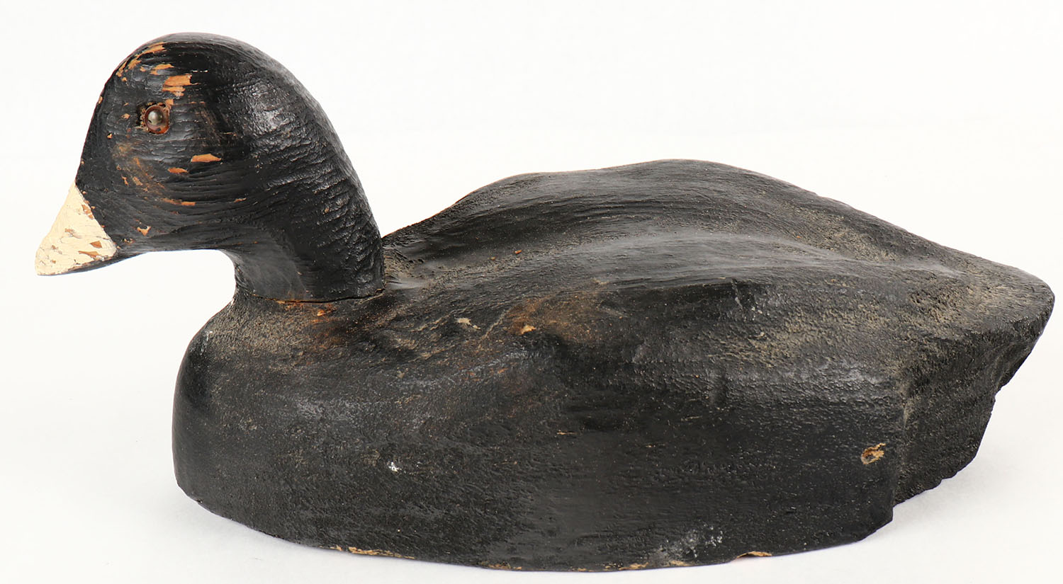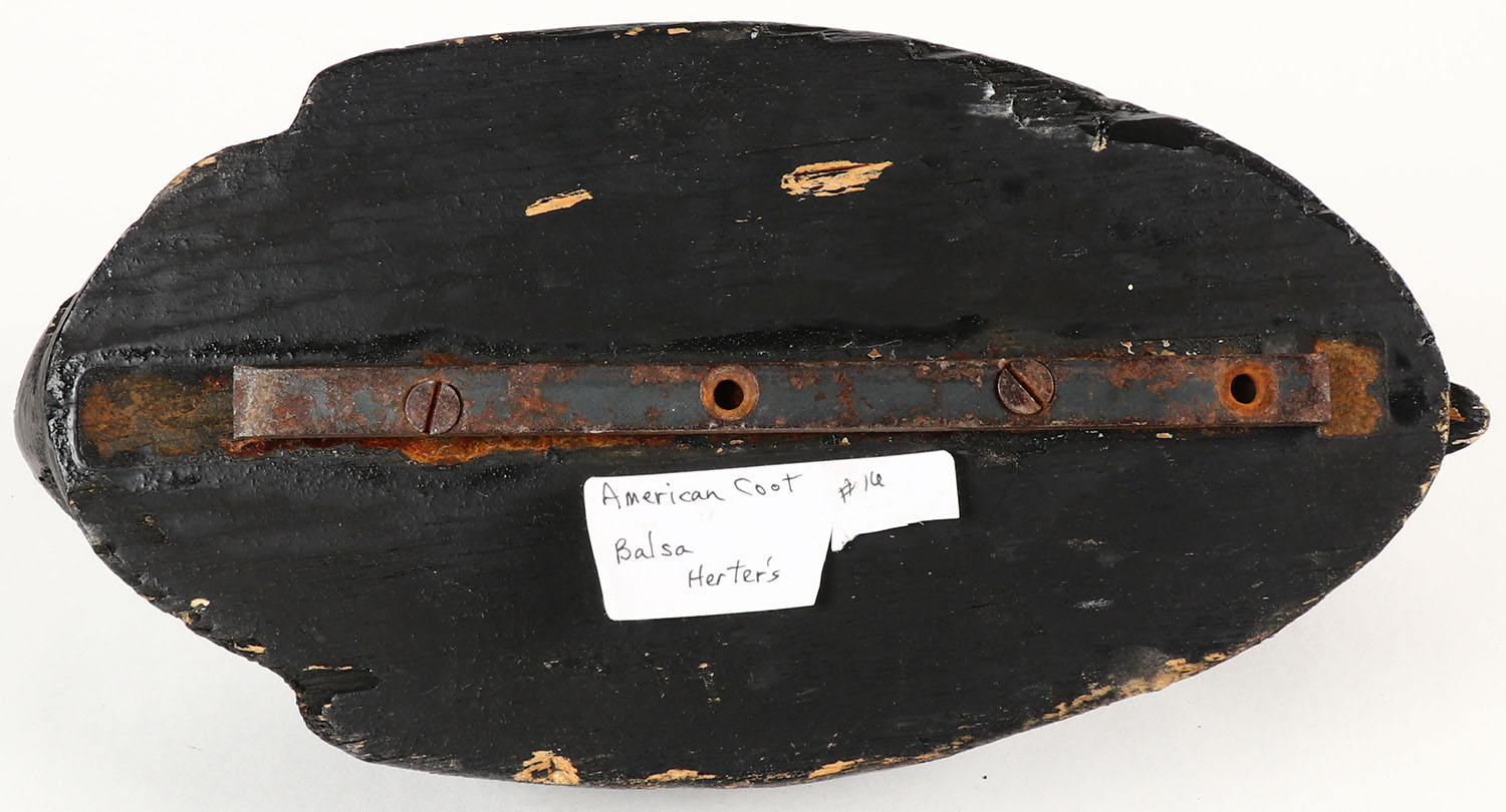 Coot by Herters Decoy Co., Waseca, MN, 1893 series, glass eyes, solid wood, original paint, structurally excellent, unmarked on bottom. Grade: Excellent - Value: 30 to 90