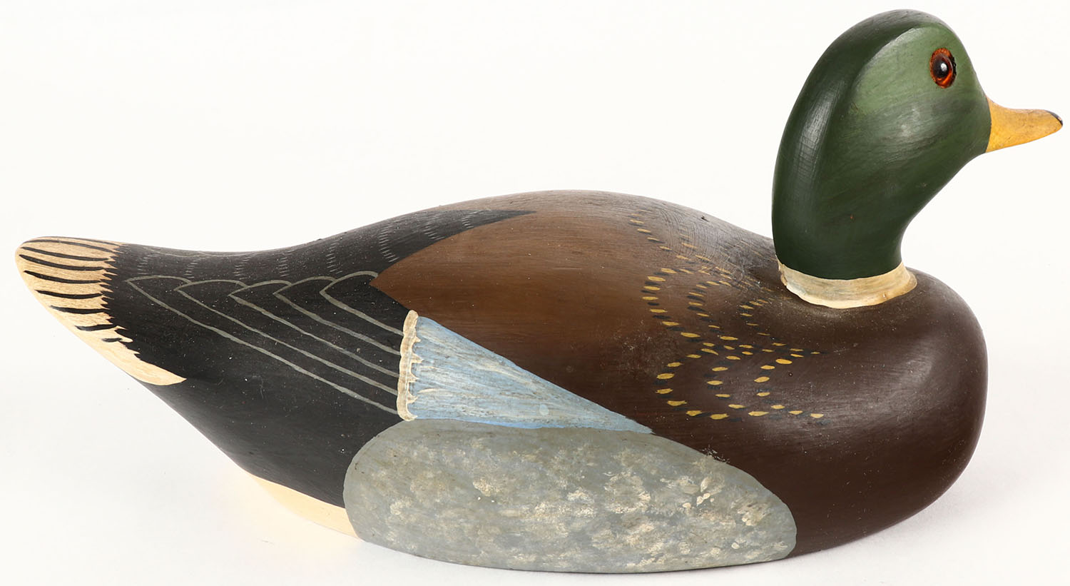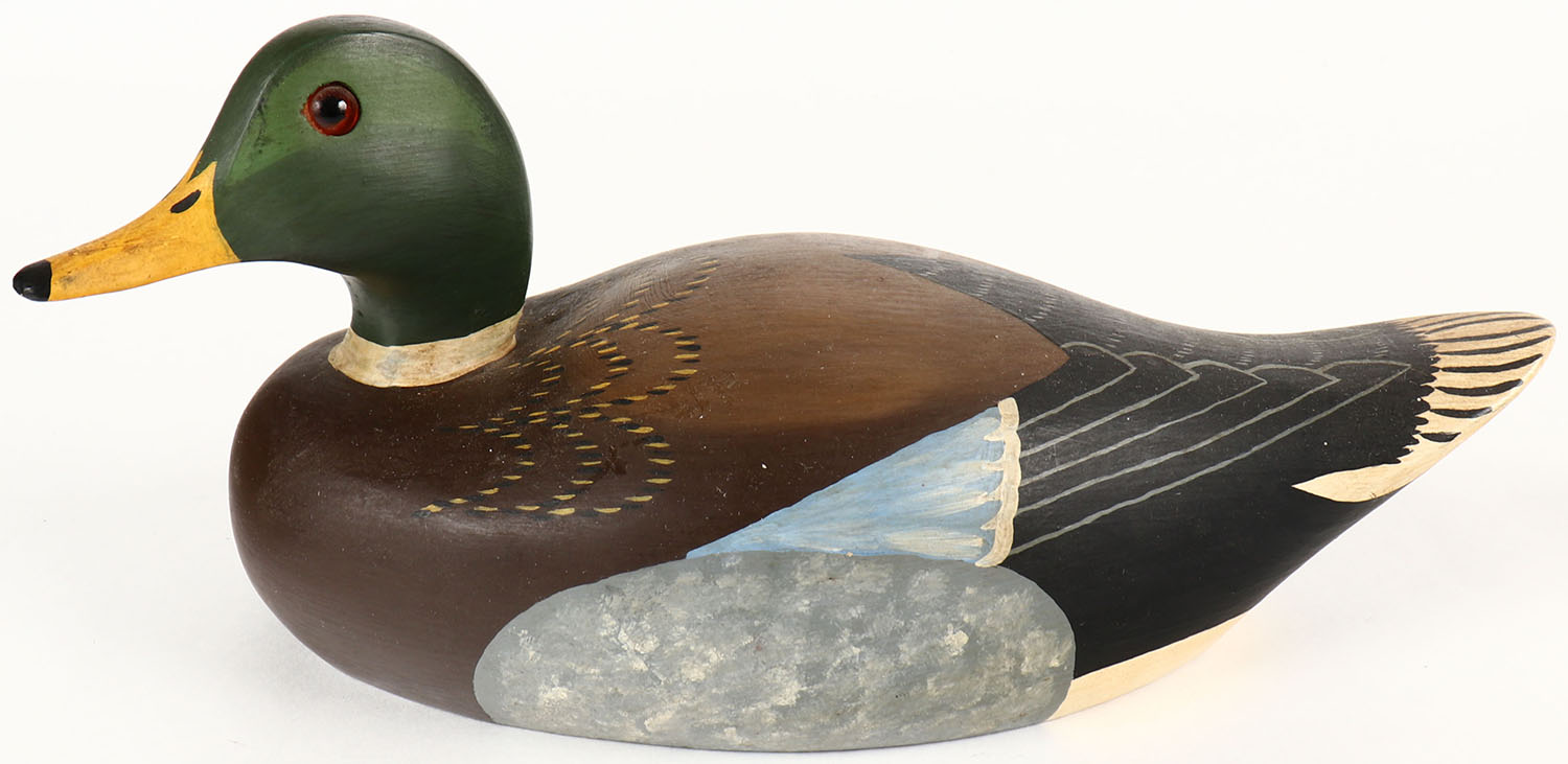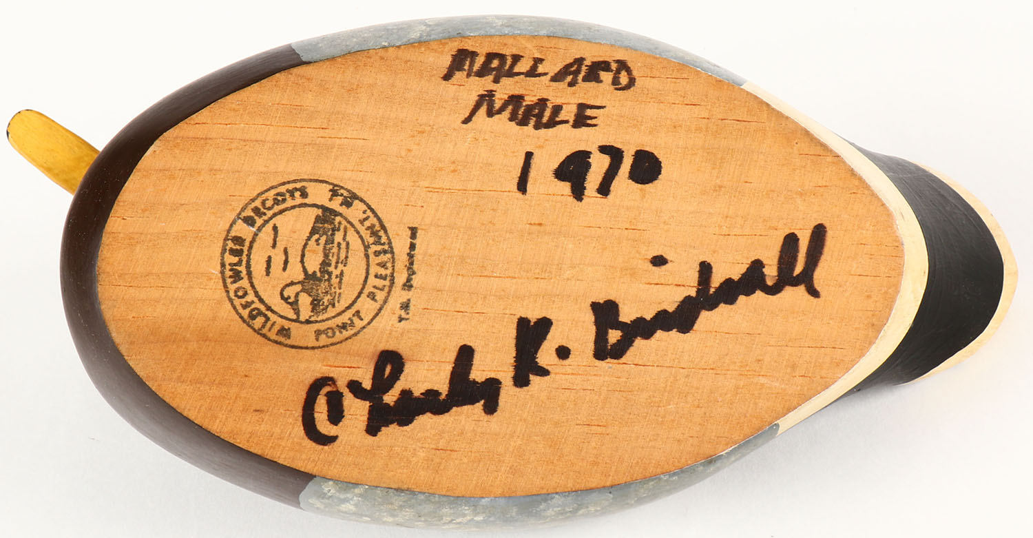 Miniature Mallard Drake by Charles Birdsall, Wildfowler Decoys, GE, solid wood, original paint, structurally excellent, signed on bottom, 10'' OAL. Grade: Excellent ++ - Value: 30 to 90