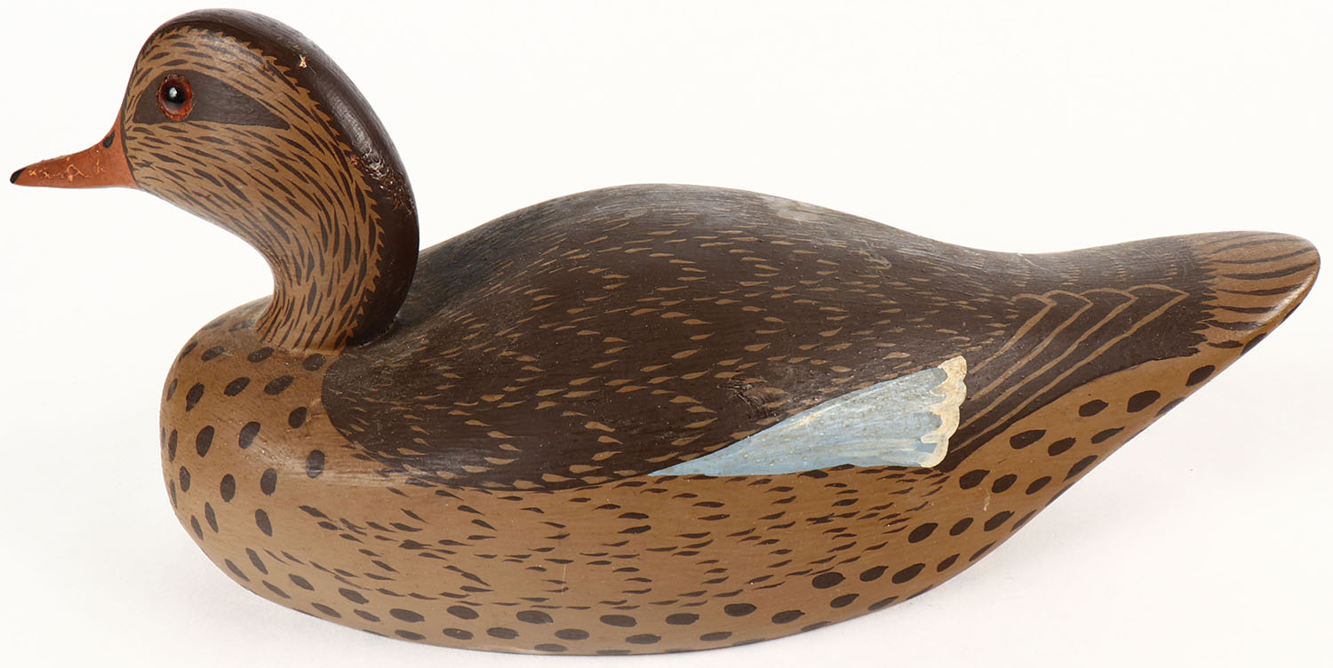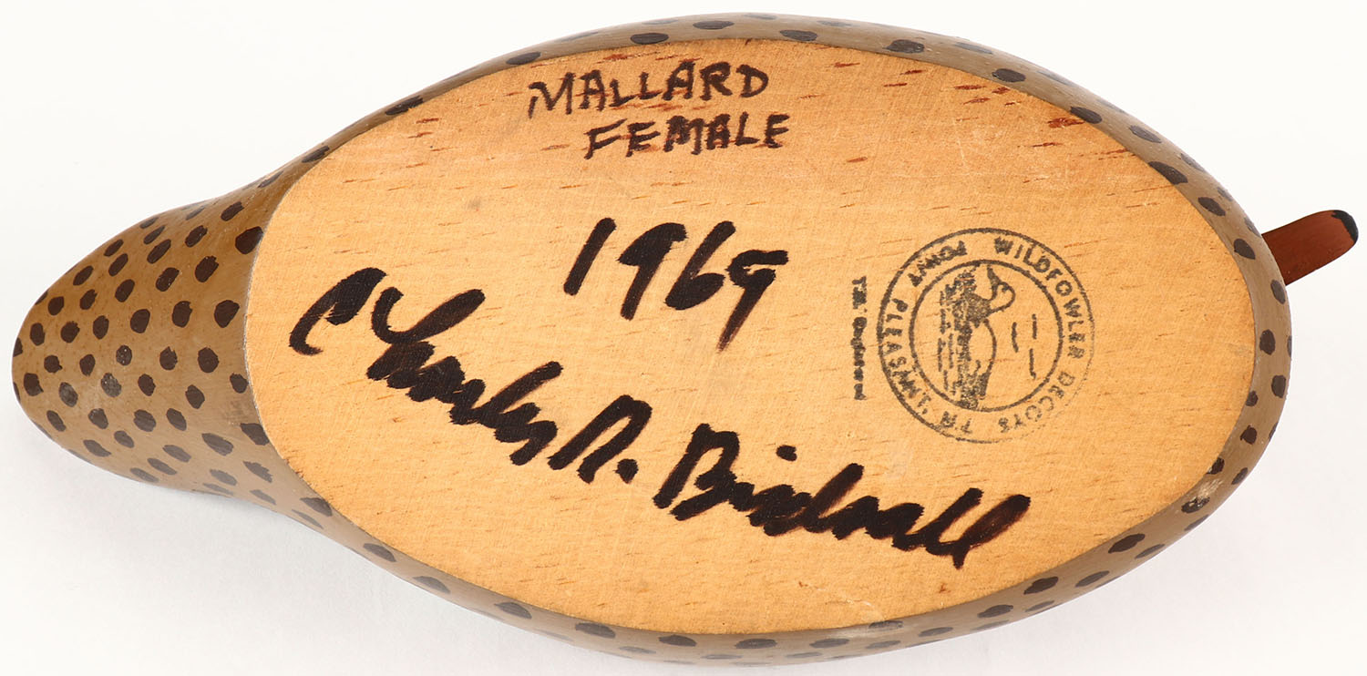 Miniature Mallard Hen by Charles Birdsall, Wildfowler Decoys, GE, solid wood, original paint, structurally excellent, signed on bottom, 10'' OAL. Grade: Excellent ++ - Value: 30 to 90
