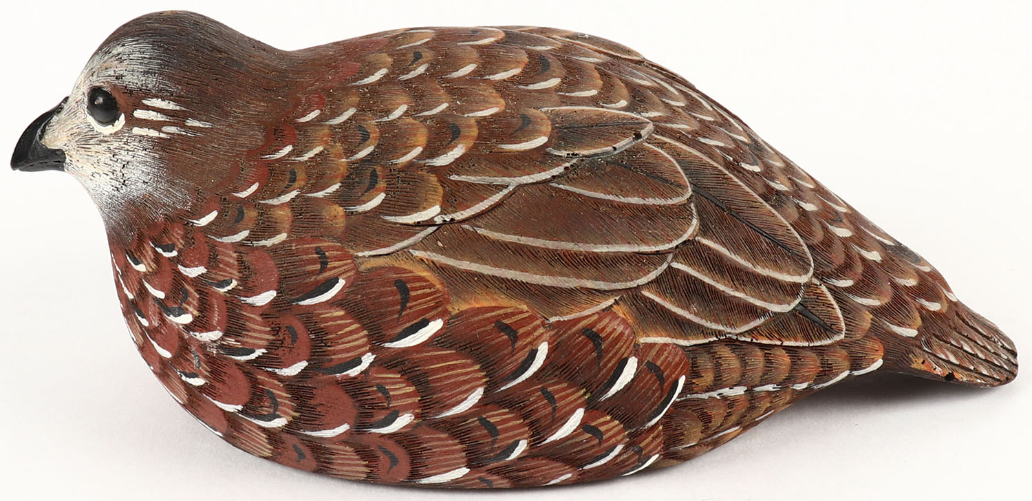 Bob White Quail by L. Finch, GE, solid wood, original paint, 7'' OAL. Grade: MINT - Value: 10 to 50