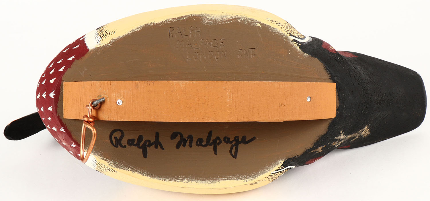 Woodduck Drake by Ralph Malpage, GE, solid wood, mint original paint, 14'' OAL. Grade: MINT - Value: 20 to 80