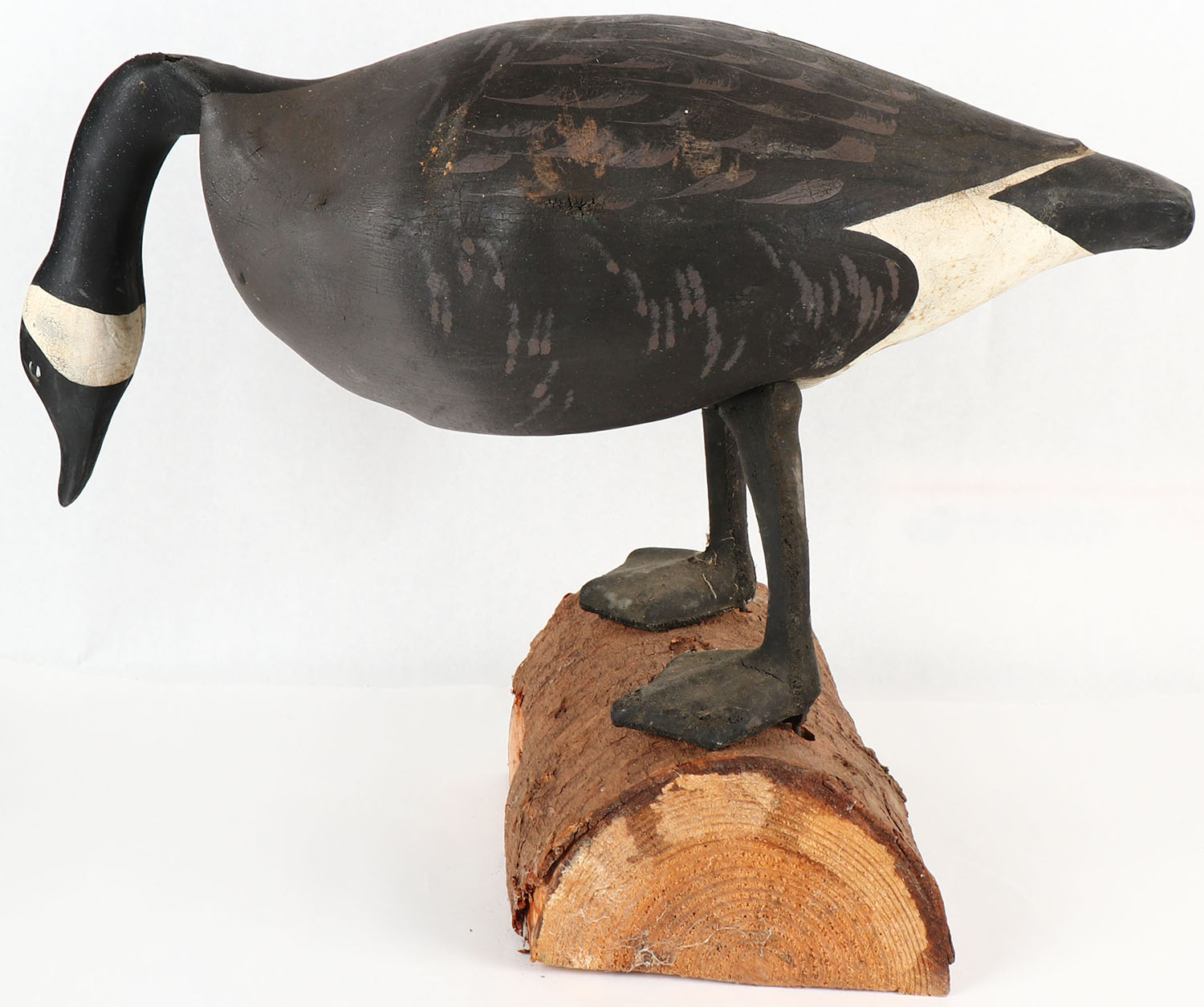 Early Canada Goose by unknown maker, PE, looks like you could have blowen this us as is it now hard rubber & a hole in the neck, large feet mounted on wood stand, 24'' OAL. Grade: Very Good - Value: 10 to 50
