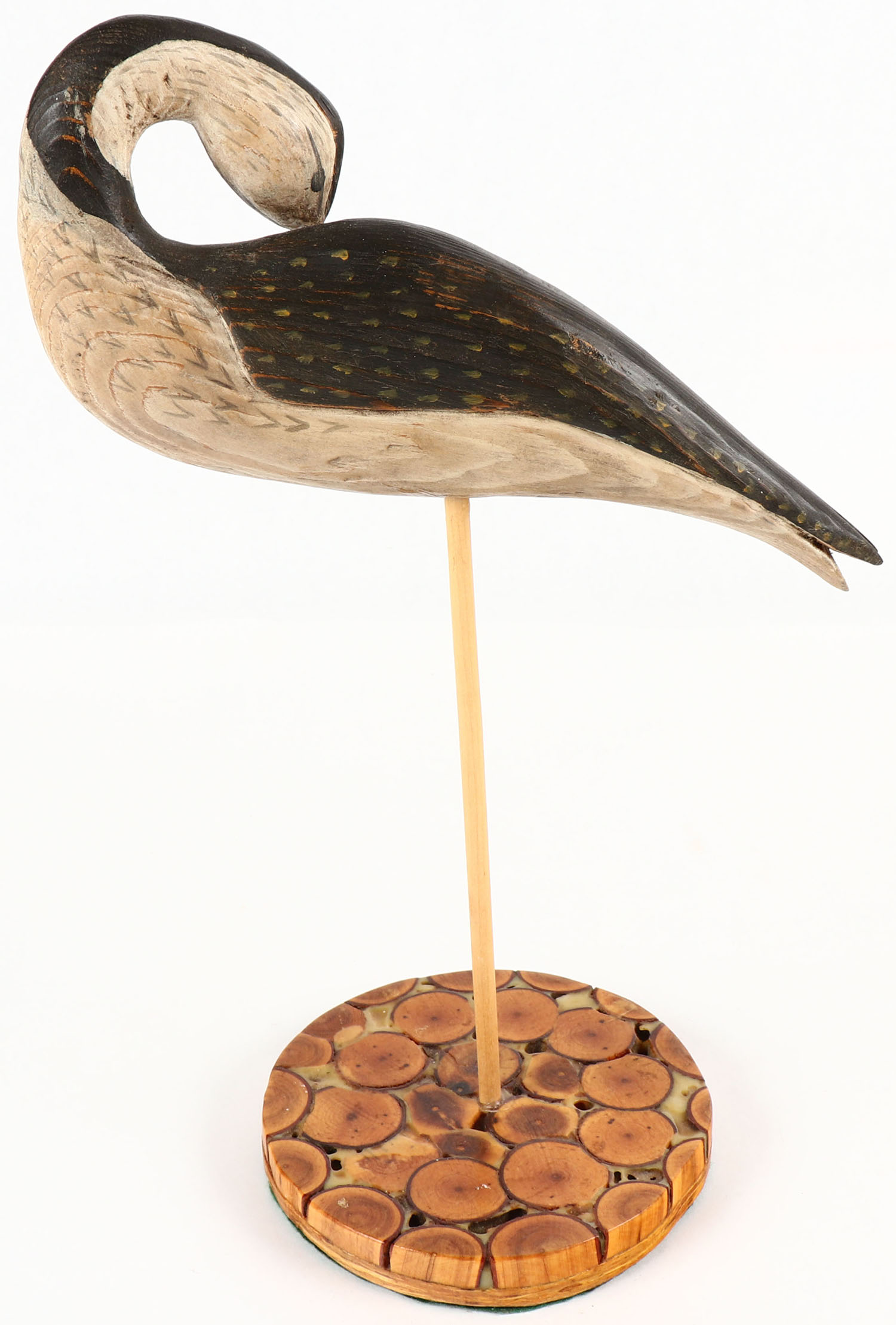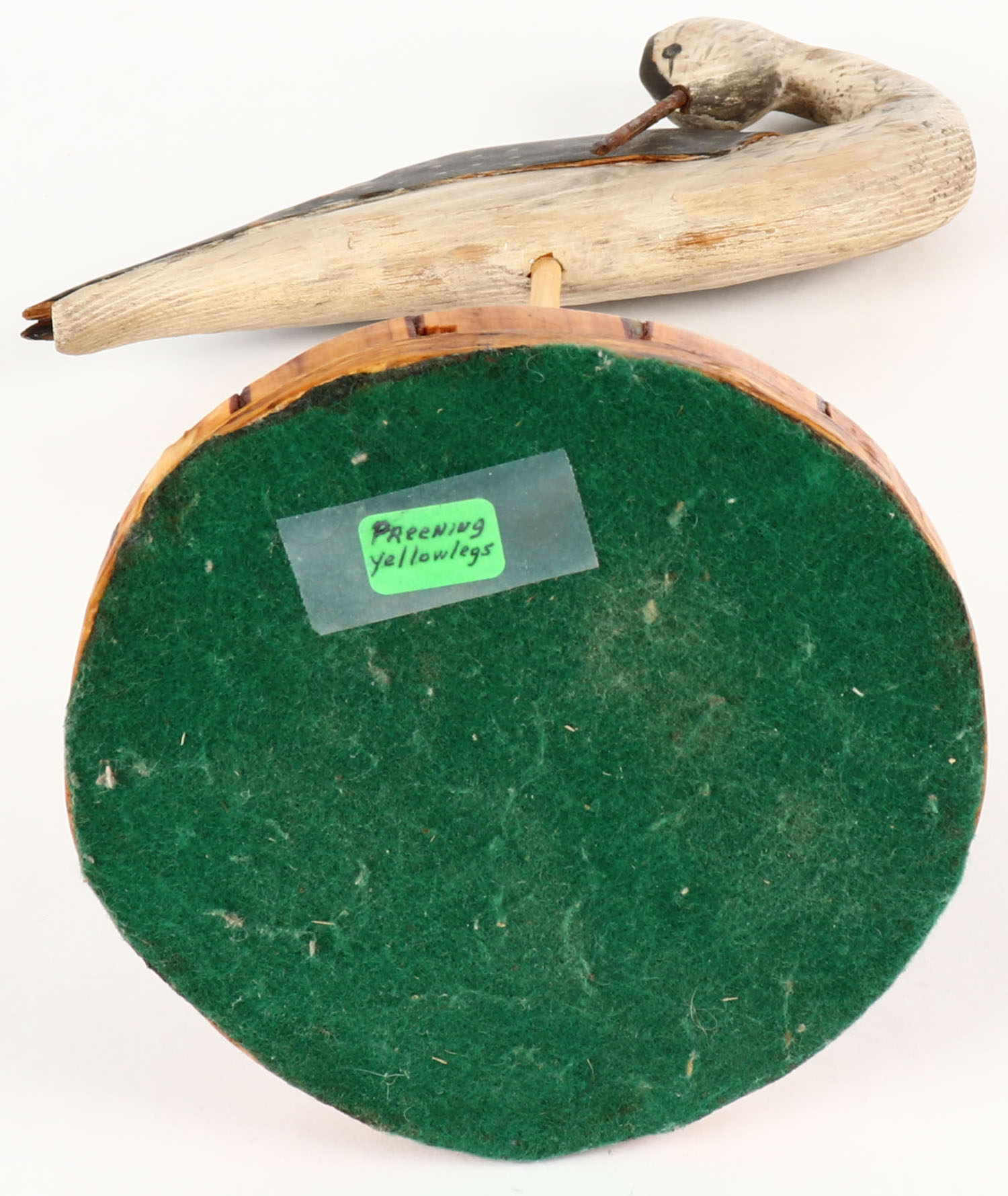 Preening Yellowlegs by unknown maker, PE, solid wood, original paint, mounted on stand, 9'' OAL. Grade: Excellent - Value: 10 to 30
