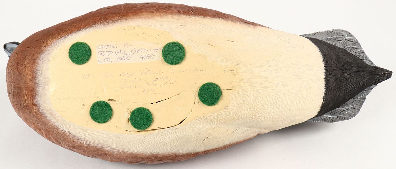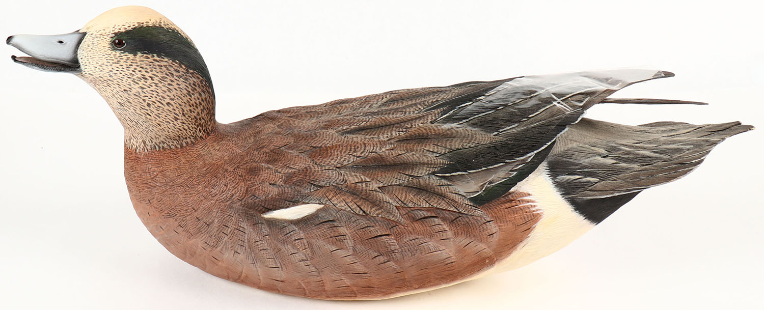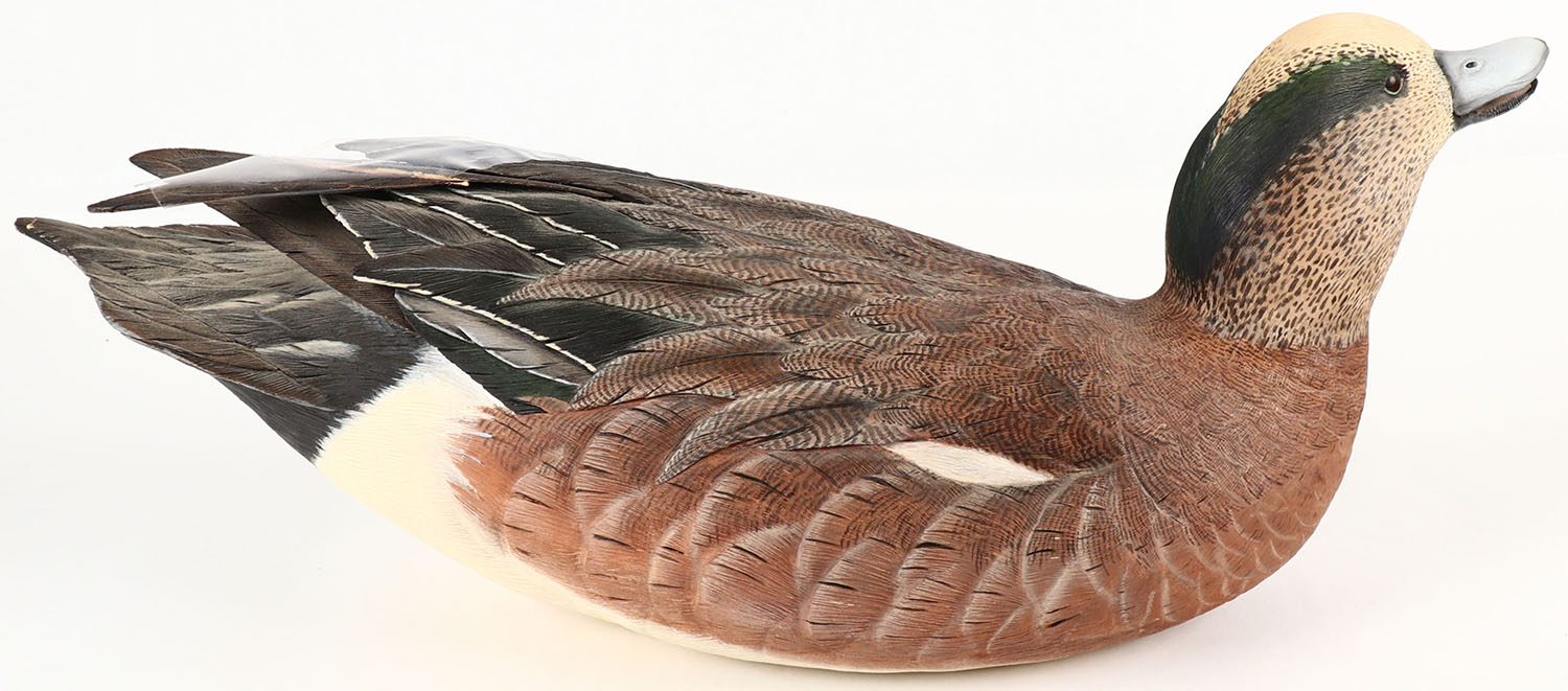 Widgeon Drake by R.D. Wilson, marked ''WON 4TH PLACE WORLD CHAMPIONSHIP, OCEAN CITY, MD 1986'', GE hollow wood, mint original paint, the crossed wing tips has one broken, 17'' OAL. Grade: Very Good ++ - Value: 30 to 100