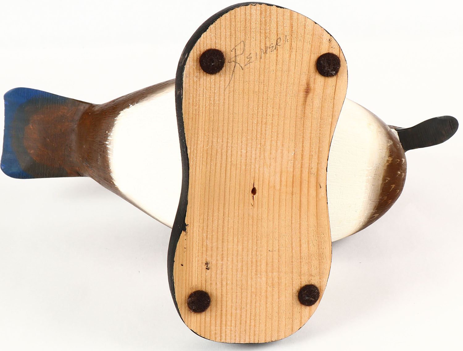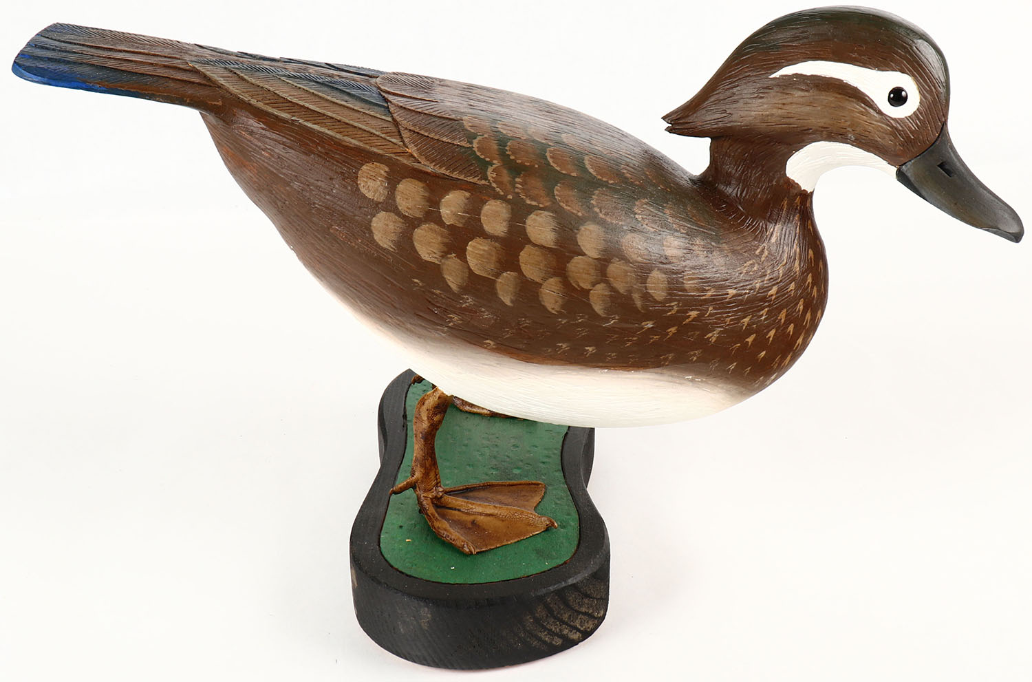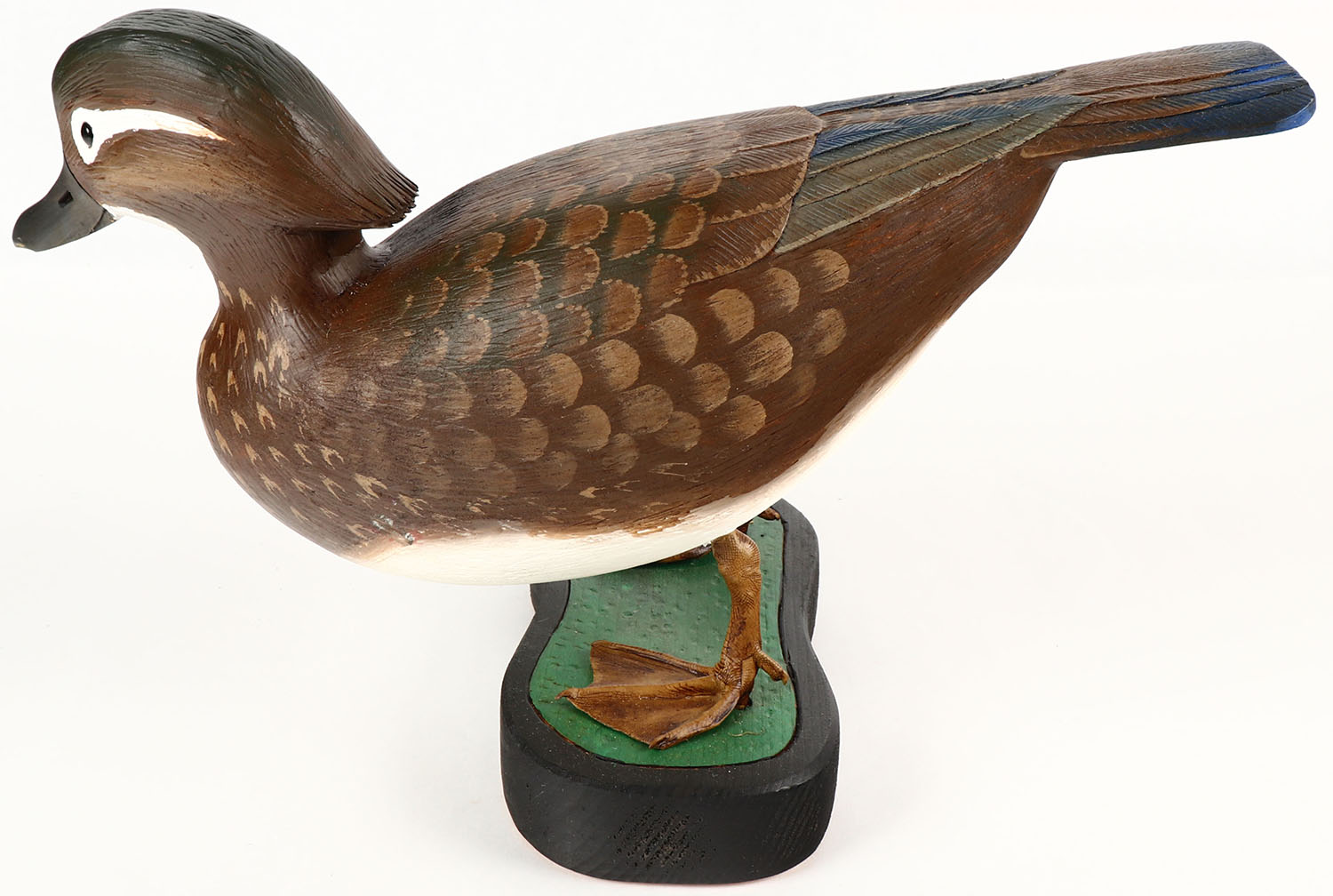 Woodduck Hen by unknown maker, GE solid wood, mint original paint, on stand, 14'' OAL. Grade: MINT - Value: 20 to 50