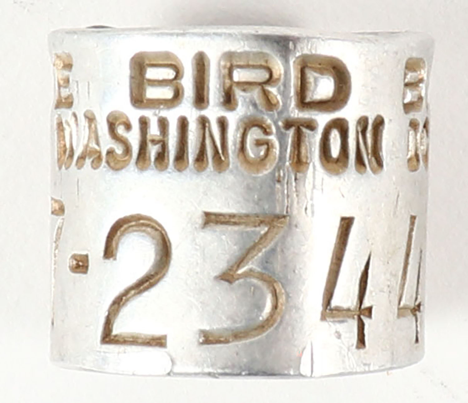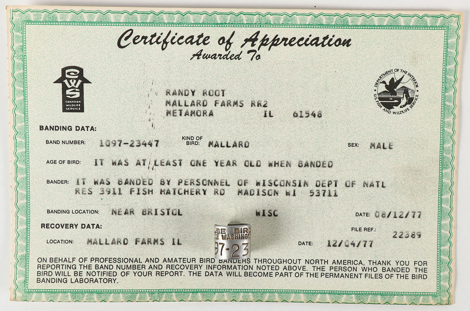 DUCK BAND, with certificate from 1977 we are offering a few duck bands that were all shot at one duck club in Peoria IL from 1964 - 1999, ''MALLARD FARMS R R 2'', this one has a certificate, this one was banded NEAR Bristol WI 08/12/77 and shot 12/04/77. Grade: Excellent - Value: 30 to 60