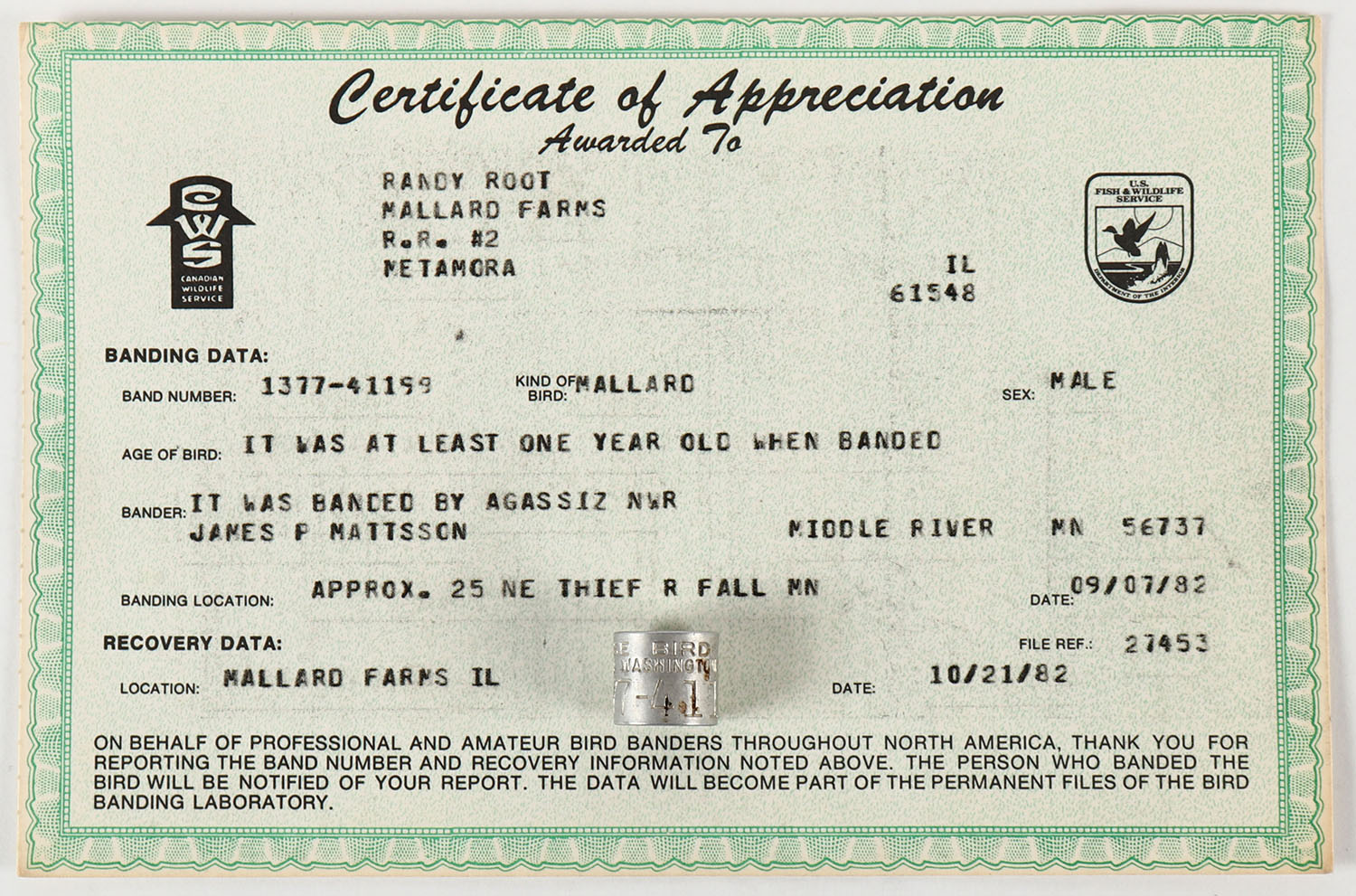 DUCK BAND, with certificate from 1982 we are offering a few duck bands that were all shot at one duck club in Peoria IL from 1964 - 1999, ''MALLARD FARMS R R 2'', this one has a certificate, this one was banded NEAR 25 mile NE of Their R Fall MN 09/07/82 and shot 10/21/82. Grade: Excellent - Value: 30 to 60