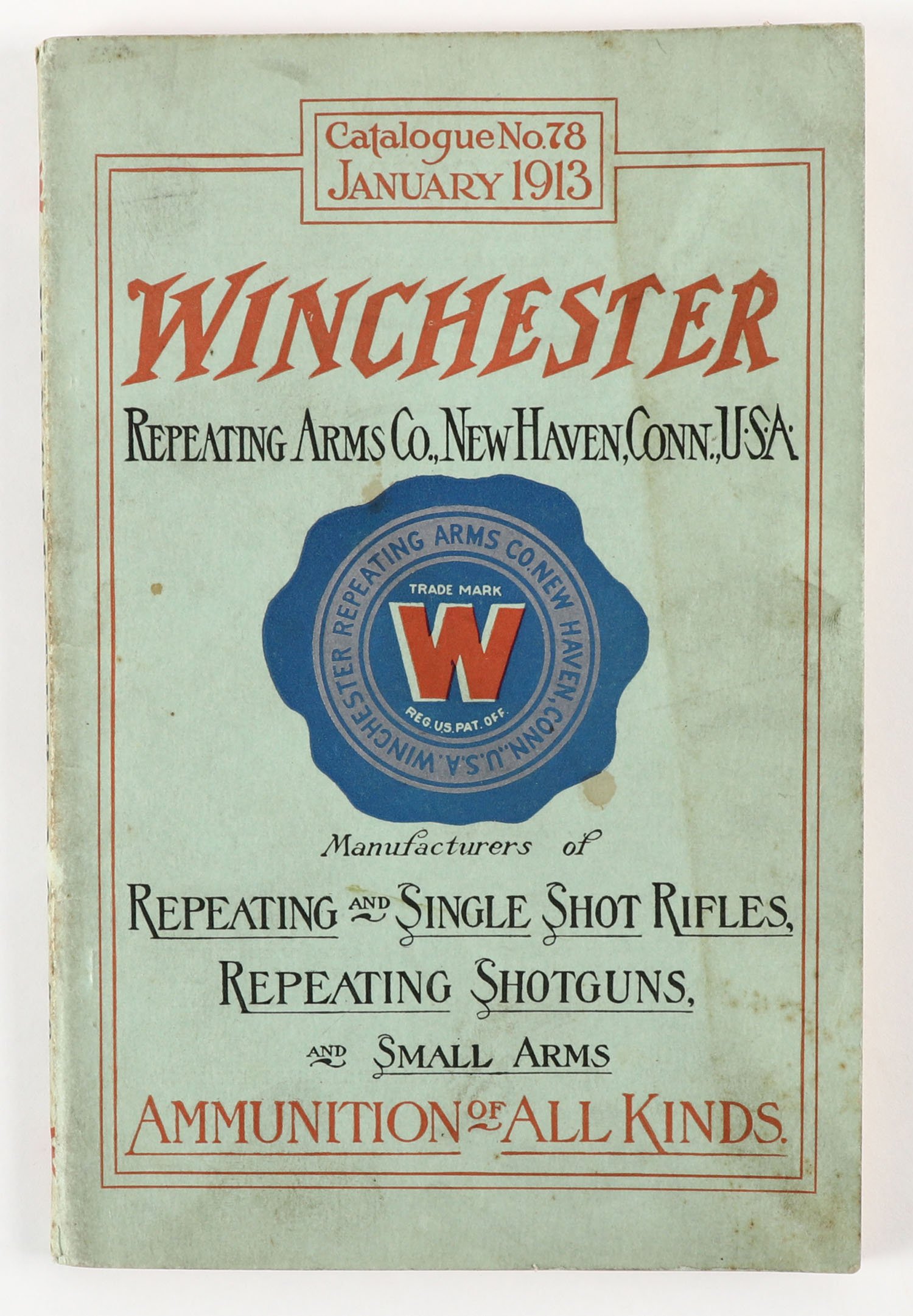 RARE! Winchester Repeating Arms Co. New Haven, Conn., U.S.A. Catalogue No. 78 January 1913 Price List of Winchester Repeating Rifles, Carbines And Muskets, Repeating Shotguns, Single Shot Rifles. Metallic Cartridges, Paper and Brass Shot Shells, Gun Wads, Primers, Percussion Caps, Loaded Shot Shells, ECT. 5 1/2'' x 9''. 212 pages, front cover is nice with a few stains, binding is tight, pages clean, softcover. Grade: Very Good ++ + - Value: 30 to 200
