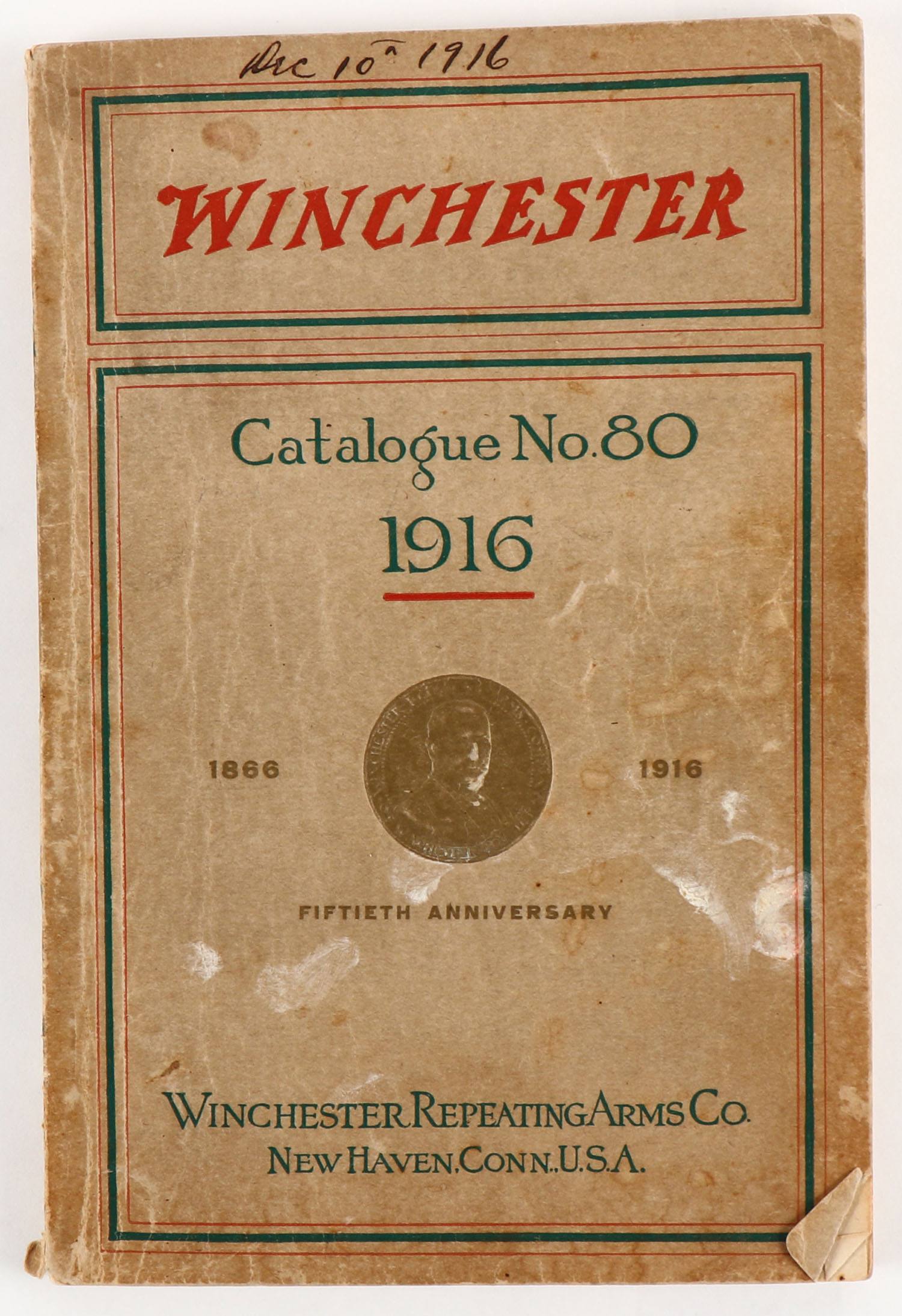 RARE! Winchester Repeating Arms Co. New Haven, Conn., U.S.A. Catalogue No. 80 1916, Price List of Winchester Repeating Rifles, Carbines And Muskets, Repeating Shotguns, Single Shot Rifles. Metallic Cartridges, Paper and Brass Shot Shells, Gun Wads, Primers, Percussion Caps, Loaded Shot Shells, ECT. 5 1/2'' x 9''. 224 pages, front cover is nice with age soiling, binding is tight, pages clean, softcover. Grade: Very Good + - Value: 30 to 200