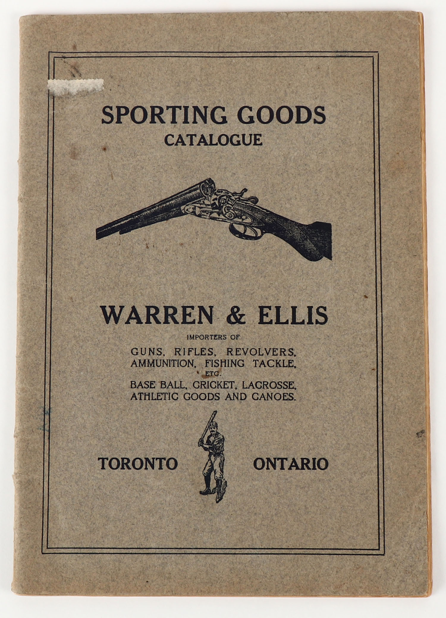 Sporting Goods Catalogue by Warren & Ellis, Toronto Ontario, 1912, 7'' X 10'', 52 pages, pages clean with age soiling, binding tight, b/w images, paper cover good with some light pencil marks, age soiling, and sticker residue. Grade: Good ++ - Value: 20 to 200