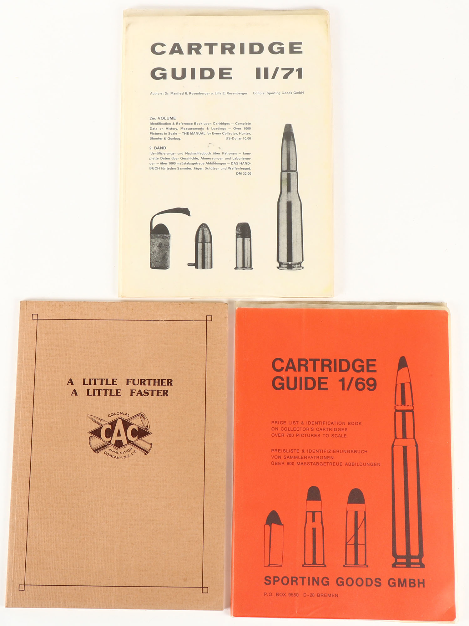 Lot of 3, (1)Cartridge Guide 11/71 by Dr. Manfred R. Rosenberger(2) Cartridge Guide 1/69 (3) CAC Ammunition Company History Booklet, all 8'' x 12''. Grade: Good ++ - Value: 2 to 20