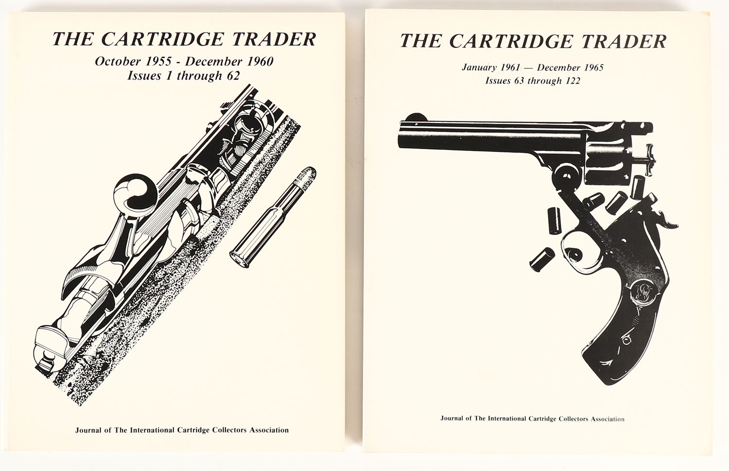 Lot of 2. (1)The Cartridge Trader October 1955 - December 1960 Issues 1 Through 62 Journal Of The International Cartridge Collectors Association (2)The Cartridge Trader January 1961 - December 1965 Issues 63 Through 122 Journal Of The International Cartridge Collectors Association, both books 8 1/2'' x 11'', pages clean, bindings tight, paper covers very good. Grade: Very Good - Value: 2 to 100