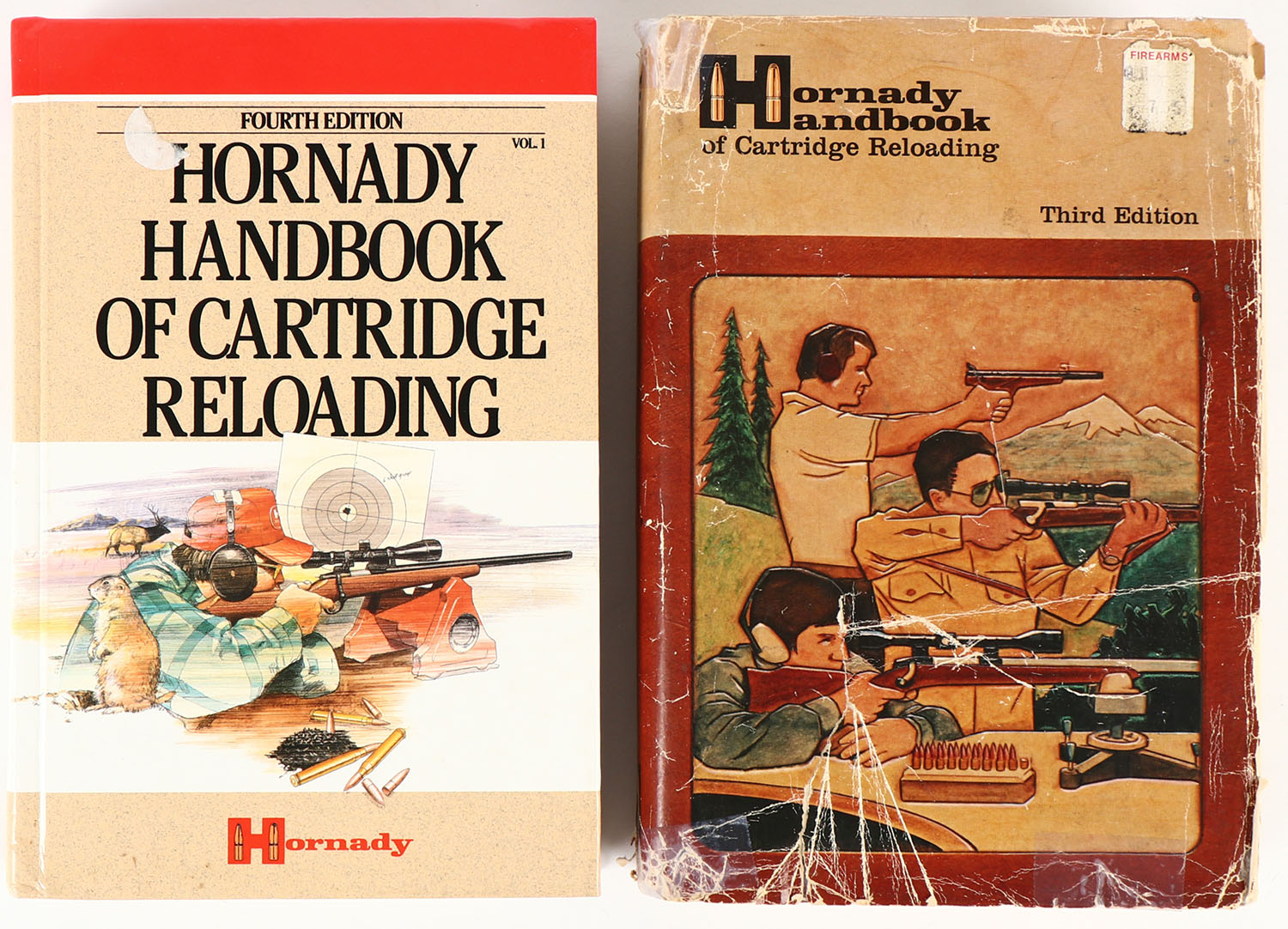 Lot of 2, (1)Hornady Handbook Of Cartridge Reloading Fourth Edition, 1997, 648 pages, pages clean, binding tight, color images, hardcover very good, (2) Hornady Handbook Of Cartridge Reloading Third Edition, 1980, 665 pages, pages clean, binding tight, hardcover good, dust jacket good with wear along edges. Grade: Very Good - Value: 4 to 40