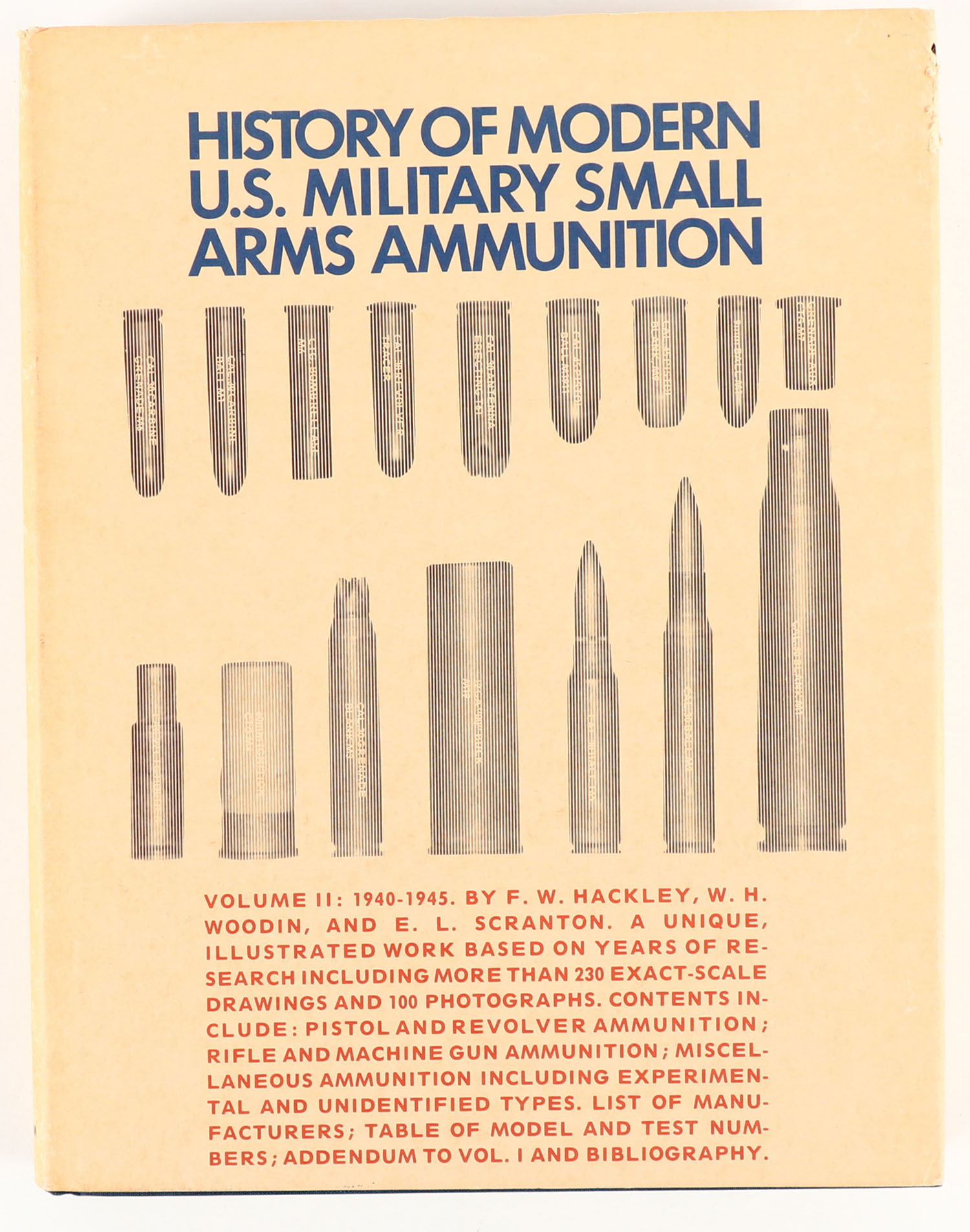 History Of Modern U.S. Military Small Arms Ammunition Volume Two 1940-1945 by F.W. Hackley W.H. Woodin and E.L. Scranton, 1978, Signed by W.H. Woodin, 9'' x 11 1/2'', 297 pages, pages clean, binding tight, b/w images, hardcover excellent, dust jacket very good with wear along edges and age soiling. Grade: Excellent - Value: 300 to 450