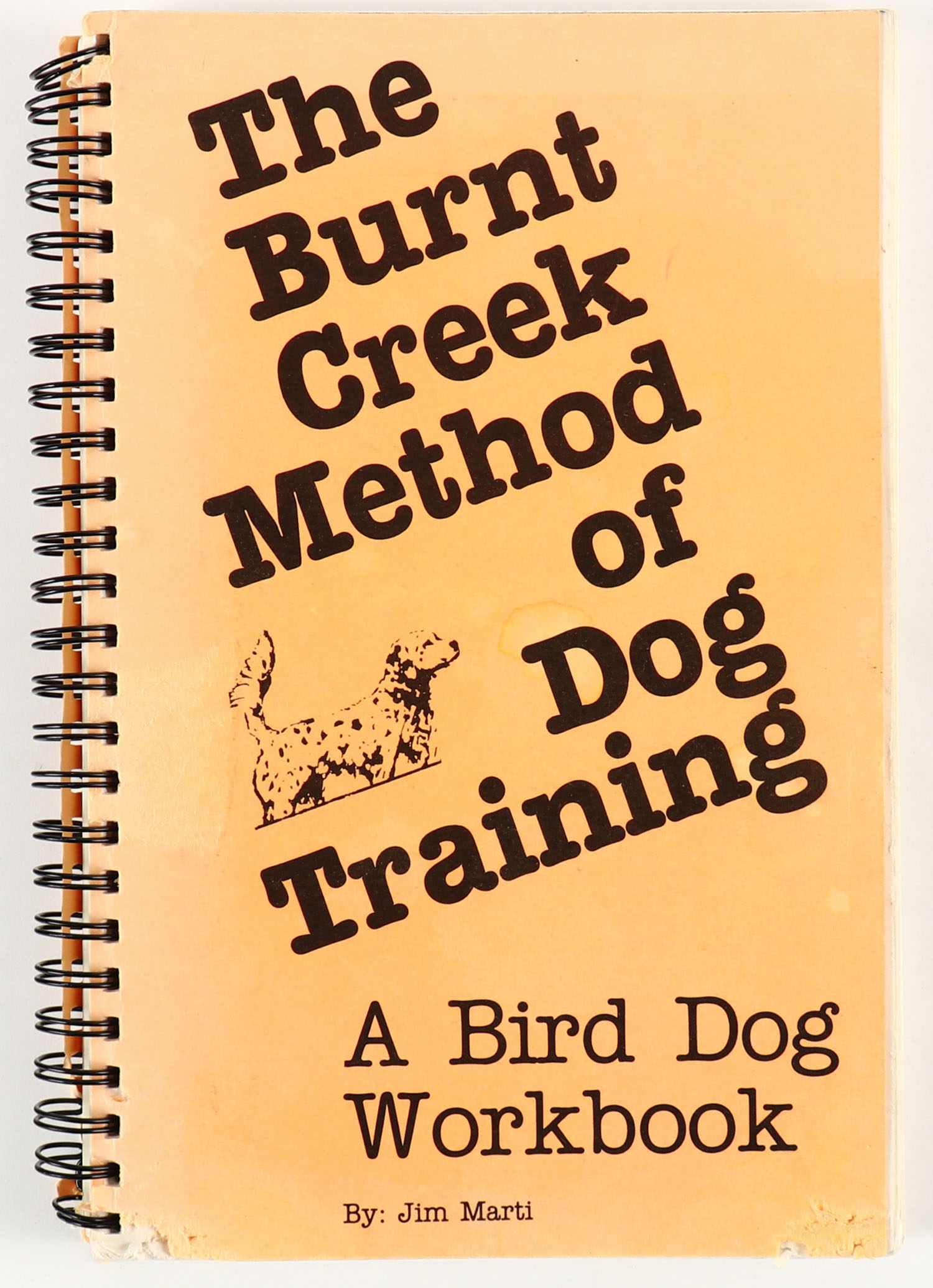 The Burnt Creek Method Of Dog Training A Bird Dog Workbook by Jim Marti, 1986, 6'' x 8 1/2'', pages have some soiling, and highlighted areas, binding tight, paper cover faded with some wear on edges. Grade: Good ++ - Value: 2 to 30